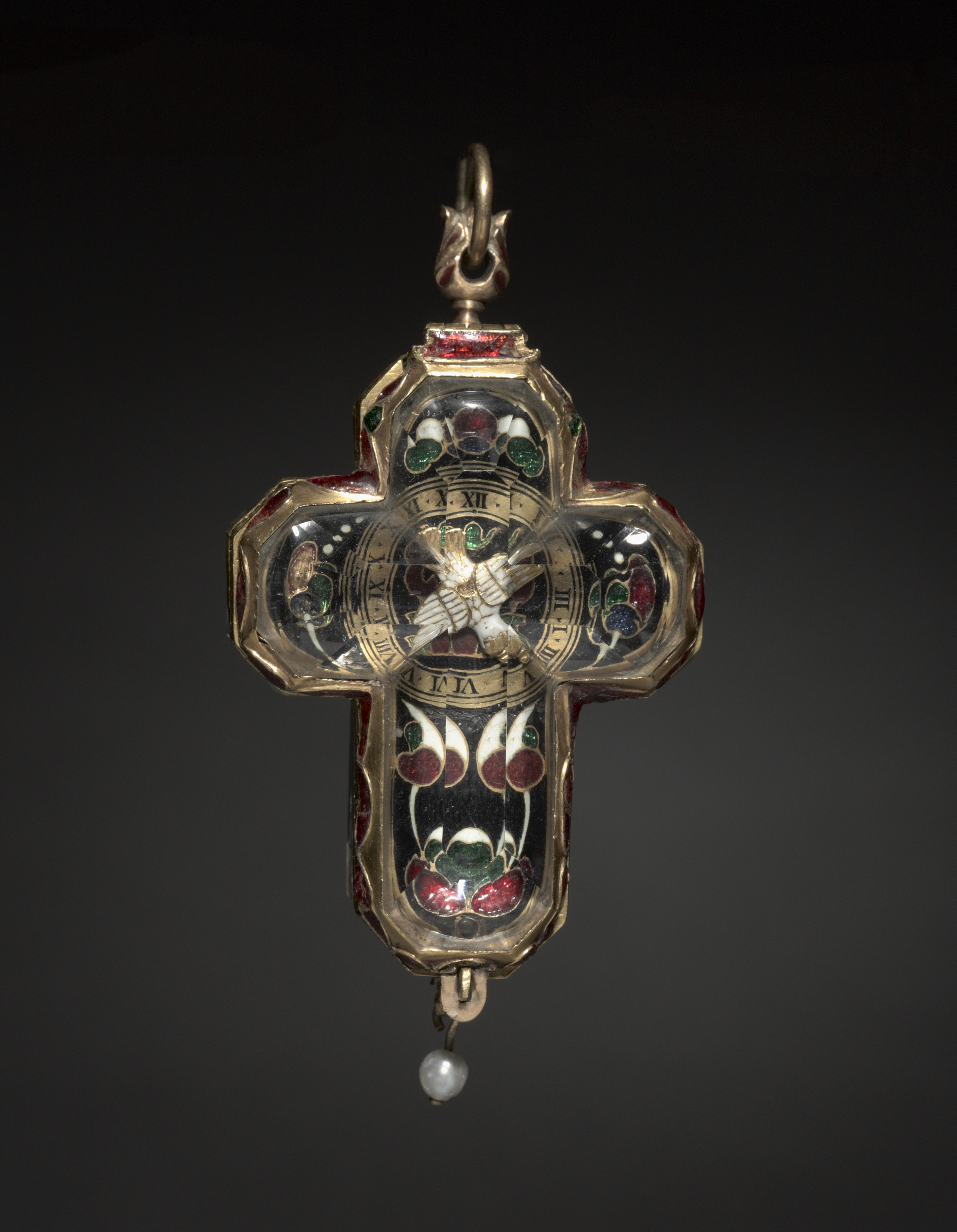 Cross-shaped clock by P. Herbier. Gold cross with a clear glass or plastic cover. The cross has a loop at the top for hanging. The center of the cross has a circular design with a white dove and Roman numerals around the edge. The cross has a black background with red, green, and blue enamel floral designs. The cross has a pearl dangling from the bottom. The background of the image is dark gray to black.