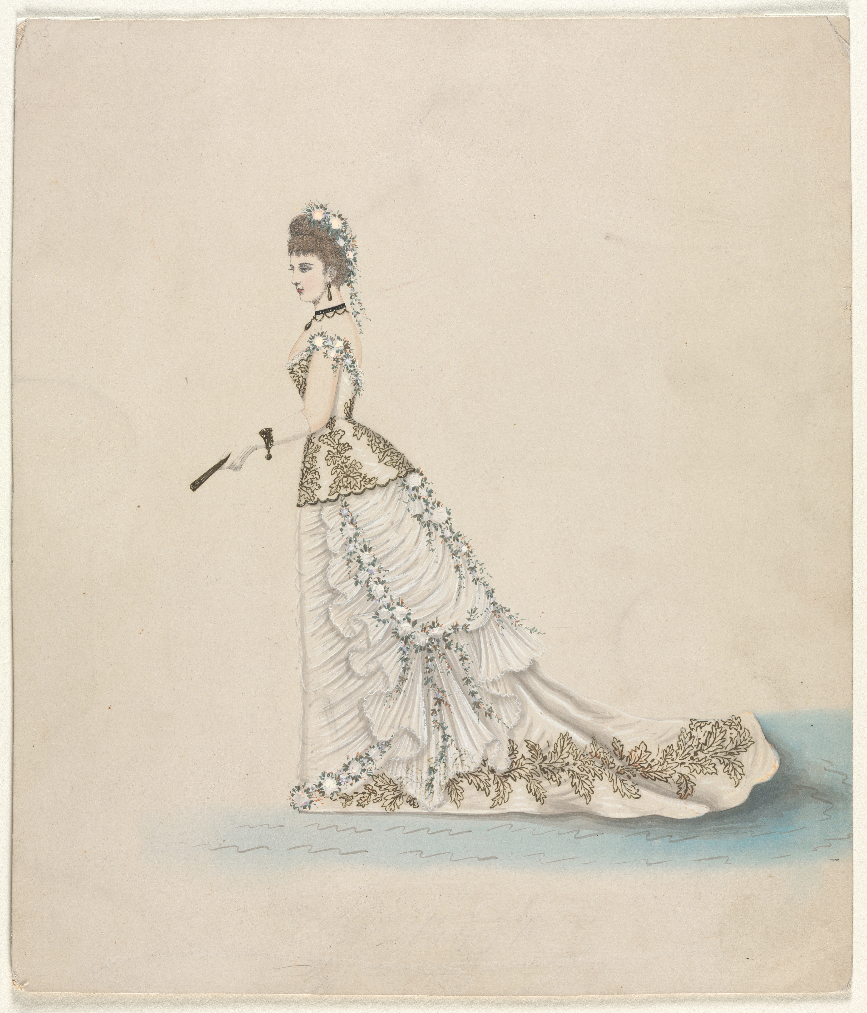 Fashion Study designed for Worth. A woman wearing a white dress with floral designs and ruffles. The woman has dark hair styled up with a floral headpiece. She wears a black choker and earrings. Her left arm is bent at the elbow and holds a fan. The dress has a short train with floral designs at the bottom. The background is beige with a blue section at the bottom.