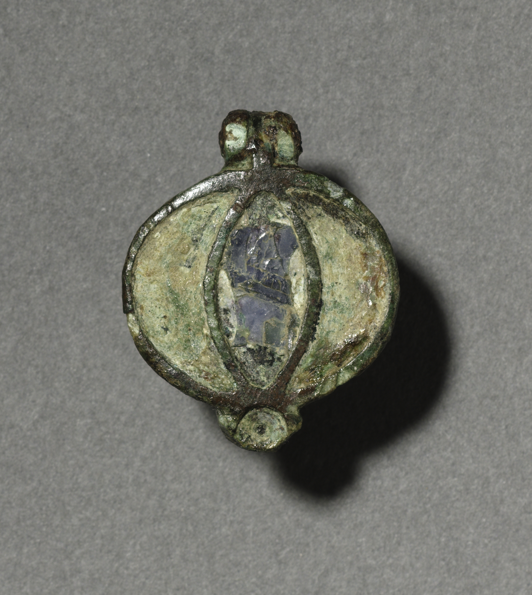 The Ornamental Brooch by Artist is a small, circular brooch with a raised, oval-shaped center. The brooch has a green patina and appears to be made of metal. It has a small loop at the top and a small knob at the bottom. The oval center has a dark-colored stone or glass insert with a lighter-colored design. The brooch has a decorative border around the edge. The background of the image is a plain gray surface.