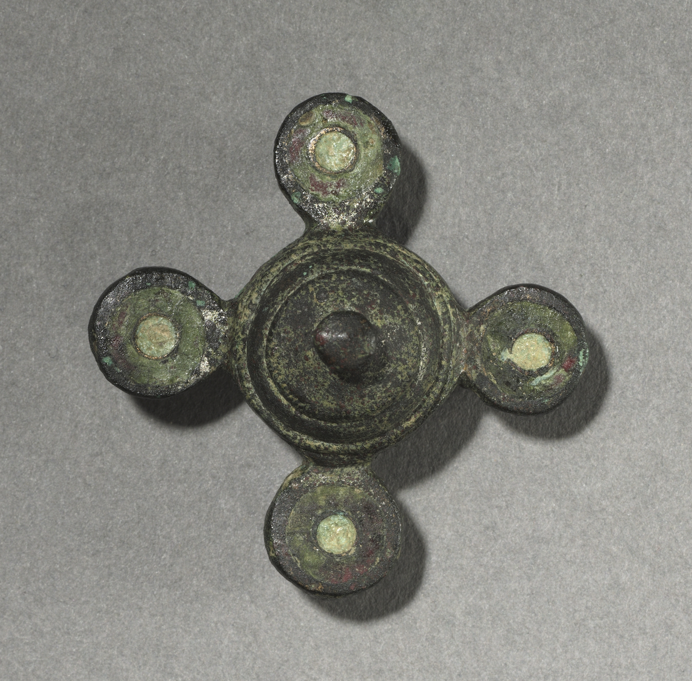 The Ornamental Brooch by artist unknown is dark green with a circular center and four protruding circular ends. A small circle is present in the center of each end. The center circle has a raised circular edge and a small protrusion. The brooch has a textured surface with visible signs of wear and tear. The background is a plain gray surface.