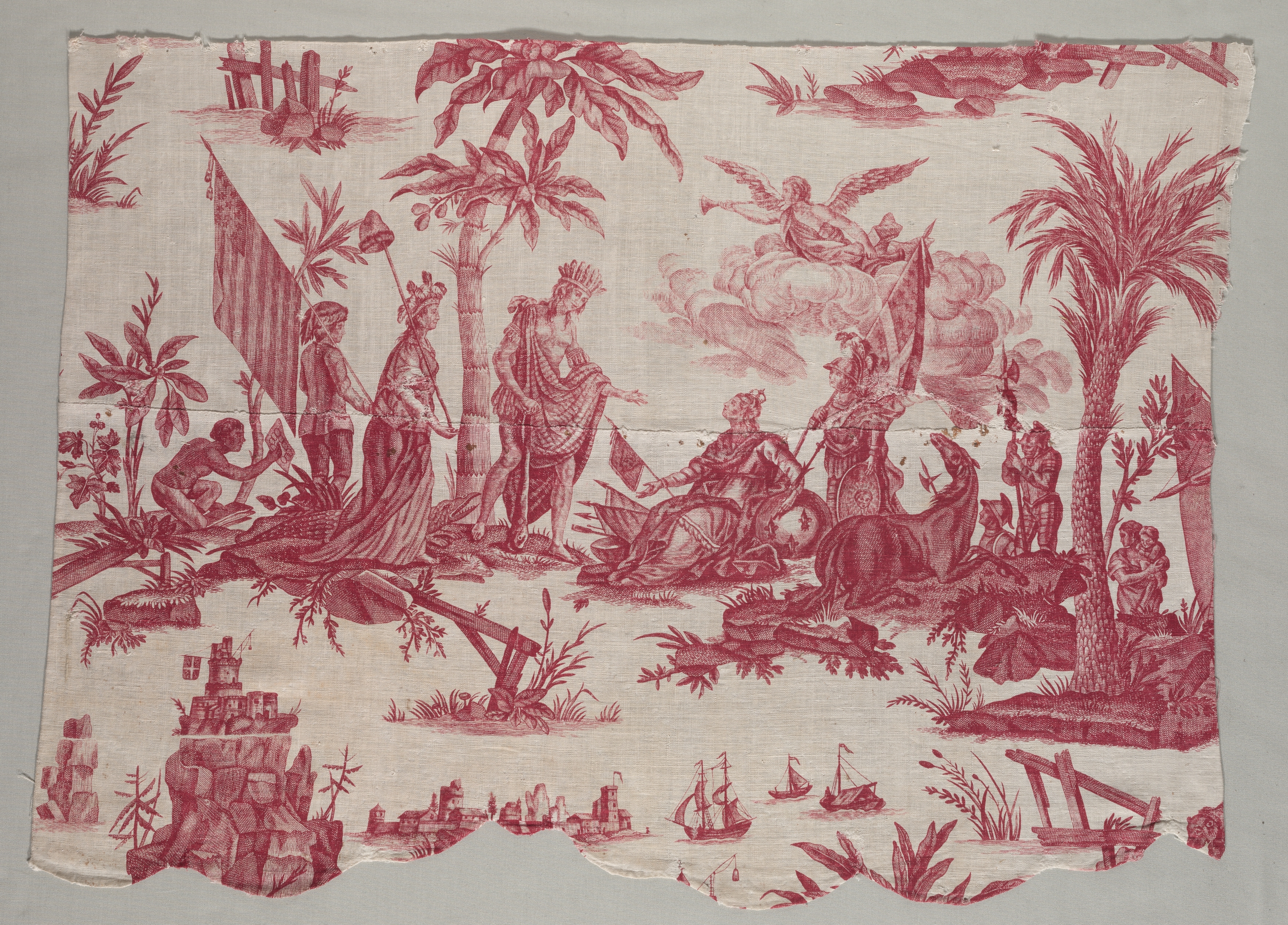 Red and white fabric with a printed design. The fabric is rectangular with rough, torn edges. The design depicts a scene in reddish-brown on a white background. Several people appear in the scene. One woman wearing a long dress and a crown-like object on her head stands on the left. A man in a headdress and draped clothing stands beside her. On the left, a nude figure crouches beside a flag on a pole. A figure wearing a helmet and armor sits on the ground on the right. Other elements in the scene include: palm trees; plants; a horse; a winged figure on clouds; a ship; buildings; and a rocky cliff. The fabric appears to be linen, with a visible weave pattern.