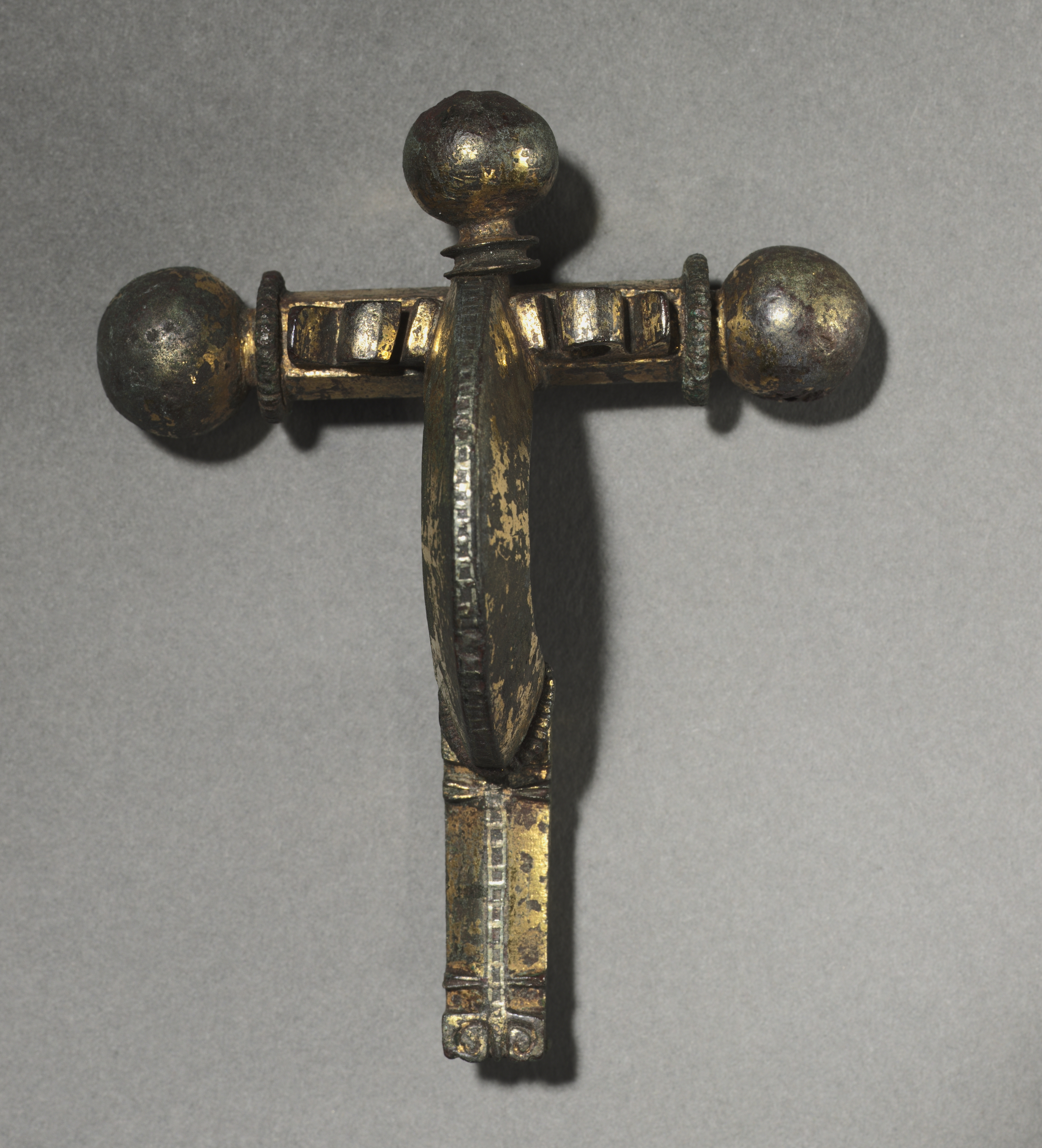 The Crossbow Fibula by an unknown artist is a cross-shaped object with a long vertical piece and two shorter horizontal pieces extending from the middle of the vertical piece. The object is made of metal, likely bronze or brass, and has a dark patina with some gold-colored areas visible. The vertical piece has a decorative pattern on it and tapers towards the bottom. The horizontal pieces have rounded ends and are connected to the vertical piece by small cylindrical sections. The ends of the horizontal pieces are spherical. The object is set against a gray background.