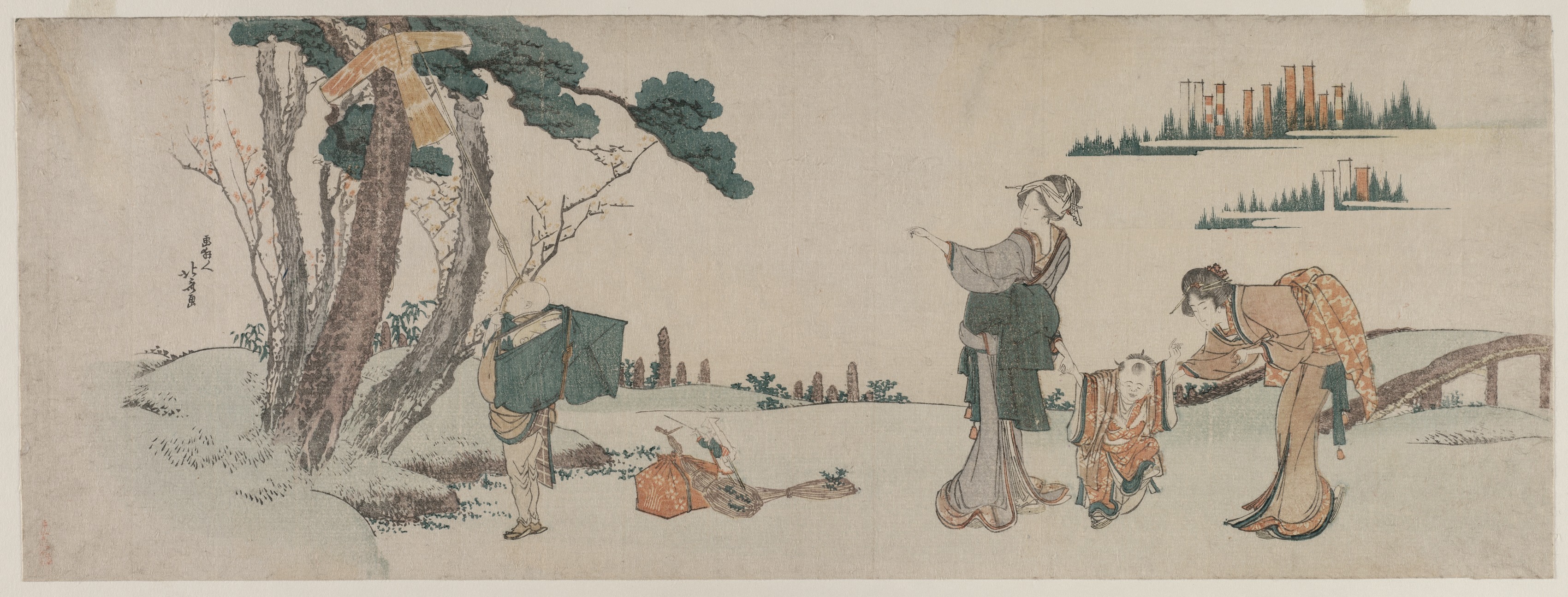 A Japanese woodblock print depicting a scene with four people and a kite. A child in an orange garment is on the ground to the left, reaching up with a stick toward a kite caught in a tree. Two women in traditional Japanese clothing are on the right. One woman is bending over, holding the arm of a small child. The other woman stands with her arm extended toward the child on the ground. A man stands to the left of the women, wearing a green garment and holding a drum. In the background, there are trees, a bridge and a cityscape. The color palette is muted, with shades of beige, green, orange and brown.