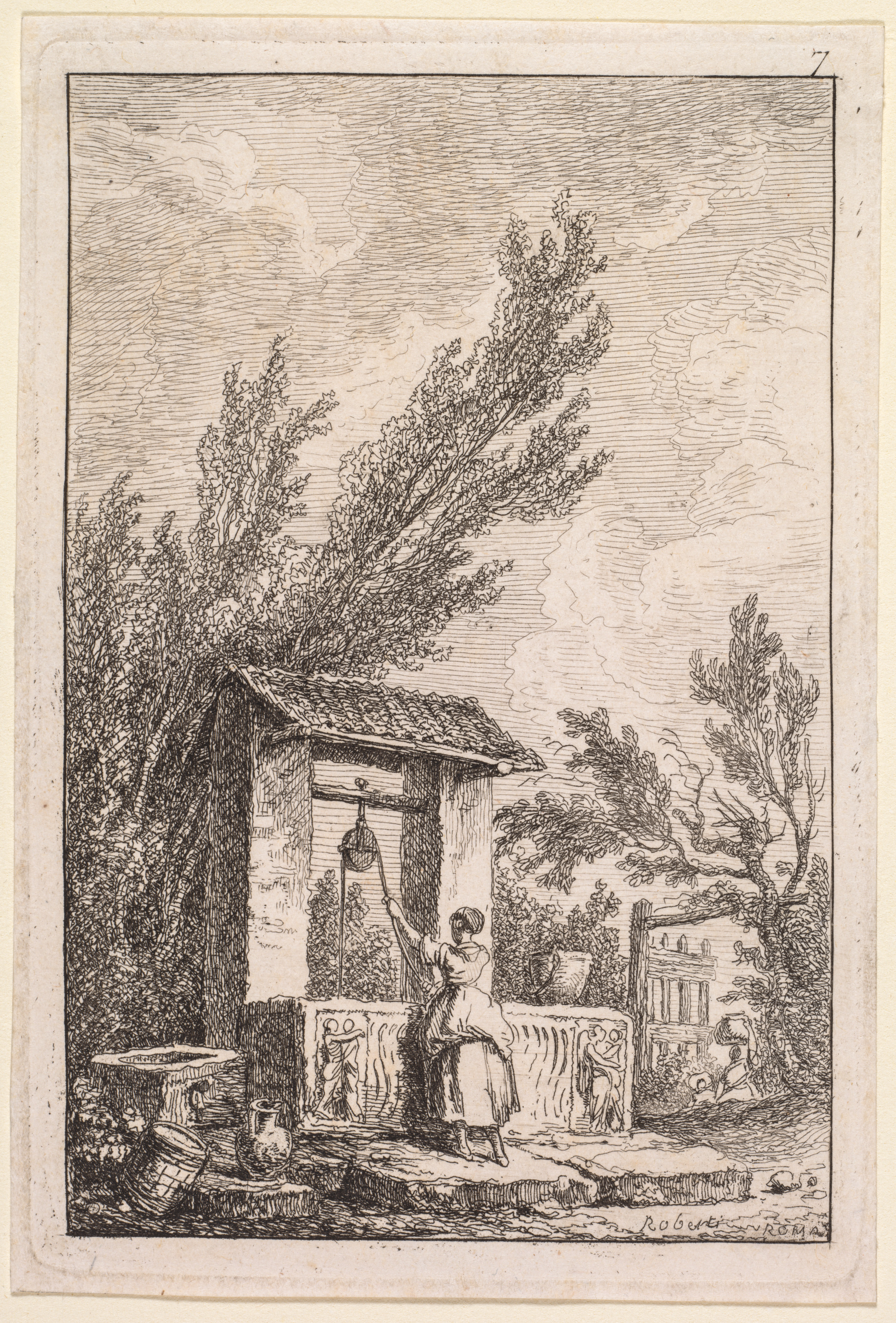 The image shows a black and white drawing titled "Le Puits" by Hubert Robert. The drawing depicts a woman standing in front of a well. The well has a roof and a pulley system with a bucket hanging from it. The woman wears a long dress and has short hair, and she faces away from the viewer, toward the well. She holds her right arm up, and her left arm is down by her side. There are trees on either side of the well, and a large tree leans over the roof. In the background, there is a large house or building with columns. The sky is cloudy. On the ground, there is a large tub or basin next to the well, and a smaller jug or vase. The drawing is signed in the bottom-right corner. The image has a thin black border around it, with a thicker beige border around that.