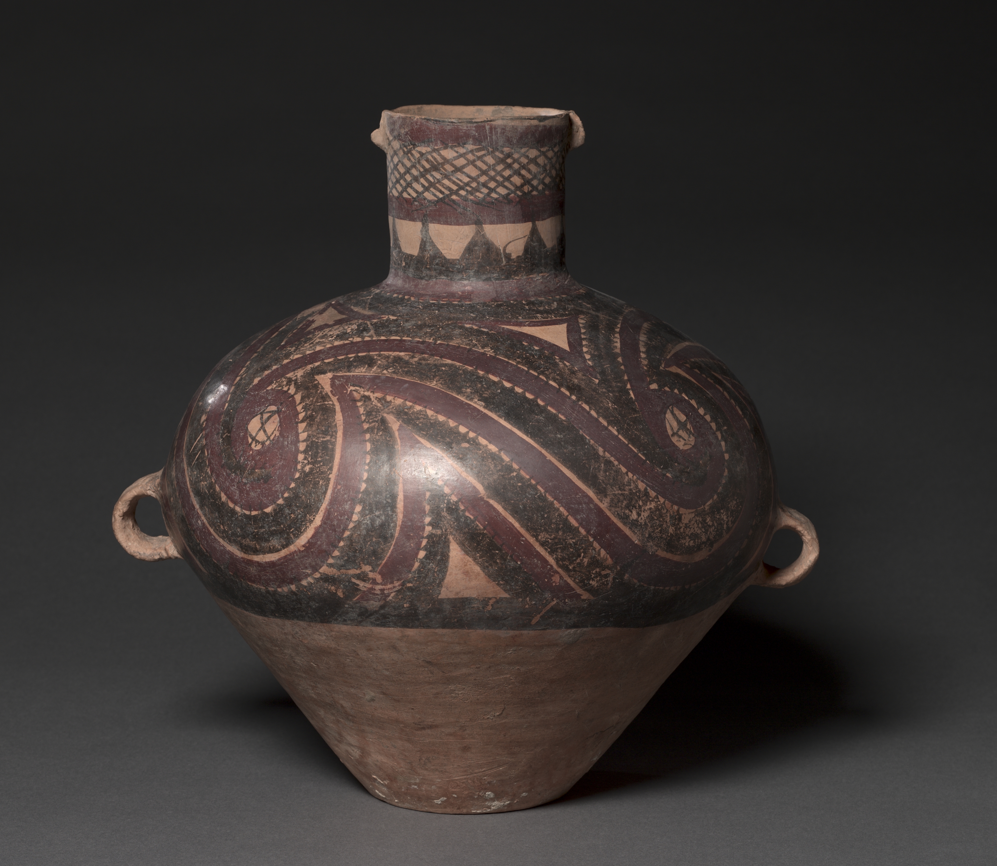 The Jar with Curvilinear Designs by Unknown Artist is a brown clay vase. The vase has a narrow neck that widens into a bulbous body and tapers down to a narrower base. Two small handles protrude from either side. The vase features a design consisting of curvilinear lines and shapes in dark brown and light brown hues on the top half. The design on the upper portion includes swirling patterns and geometric shapes. The lower half of the vase is plain. The background is dark grey.