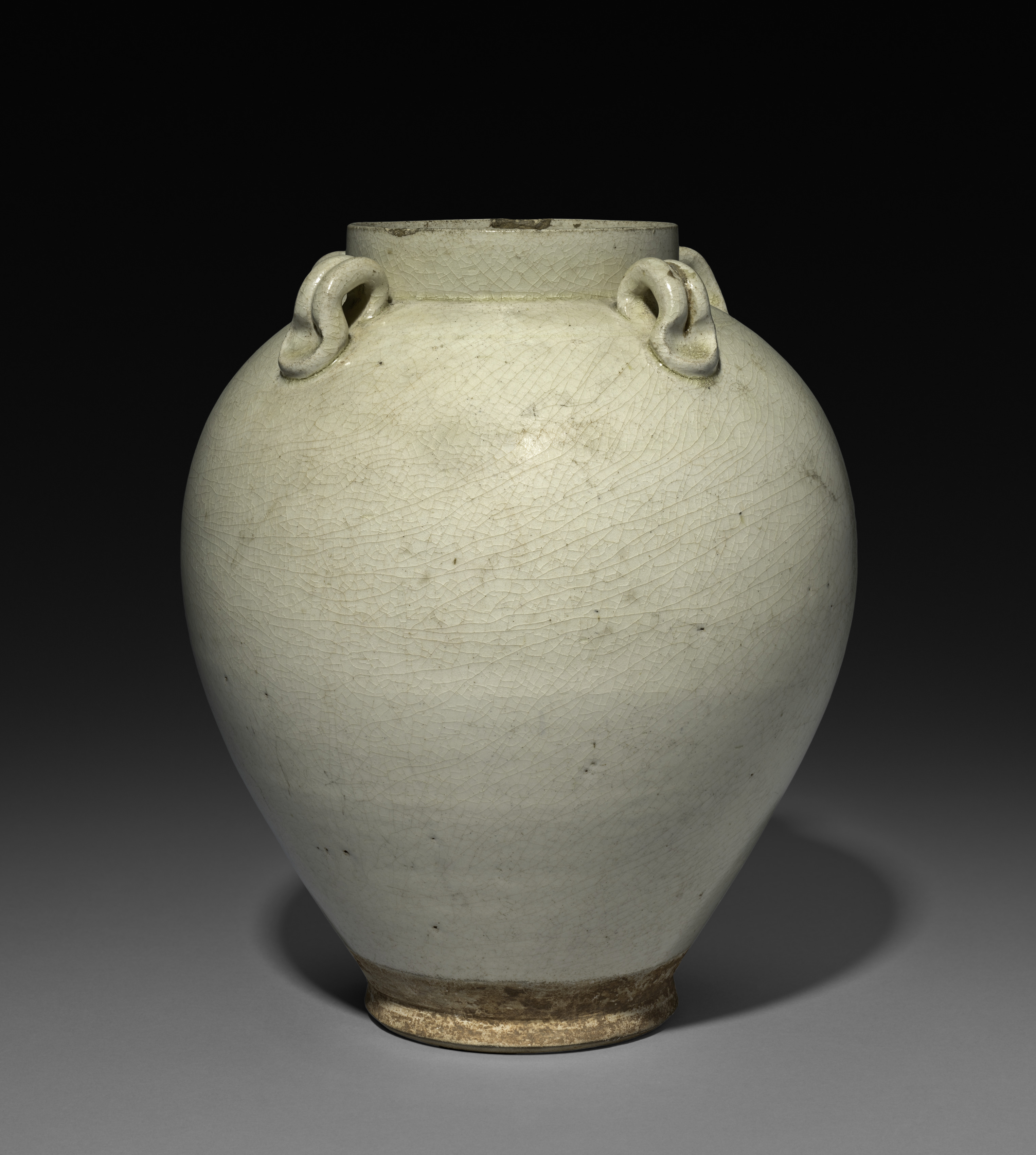 The image depicts a ceramic jar by artist unknown. The jar is white with a crackled glaze and a wide, rounded body that tapers slightly at the top. The jar has two small handles on either side, each shaped like a curved loop. The base of the jar is narrow and flat, with a small foot ring. The jar's surface features a network of fine cracks. The background is dark at the top and gradually lightens towards the bottom, with the jar casting a shadow on the surface below. The jar appears to be ancient.