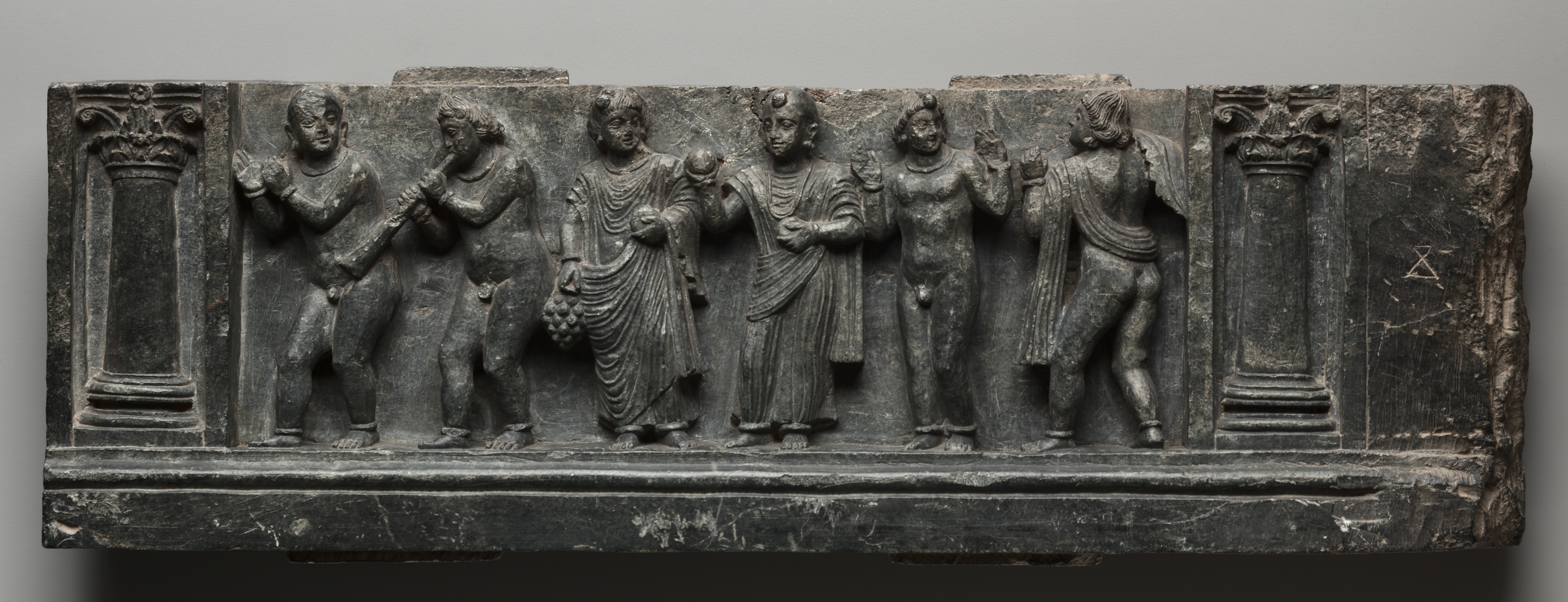 Dark gray stone carving, possibly slate or basalt. Rectangular shape with flat top and bottom. Two short columns, one on each side, each with a decorative crown at the top. Six figures carved in relief across the center. From left to right: - A figure wearing a short tunic plays a stringed instrument. - A figure wearing a loincloth plays a flute. - A figure in a long tunic carries a bunch of fruit or flowers in one hand and an object in the other. - A figure with a cloth wrapped around the right shoulder and left hip holds an object. - A figure with an exposed upper body and loincloth holds objects in both hands. - A figure with a cloth wrapped around the waist and over the right shoulder holds an object. The figures appear to be walking in a procession. The background of the image is gray.