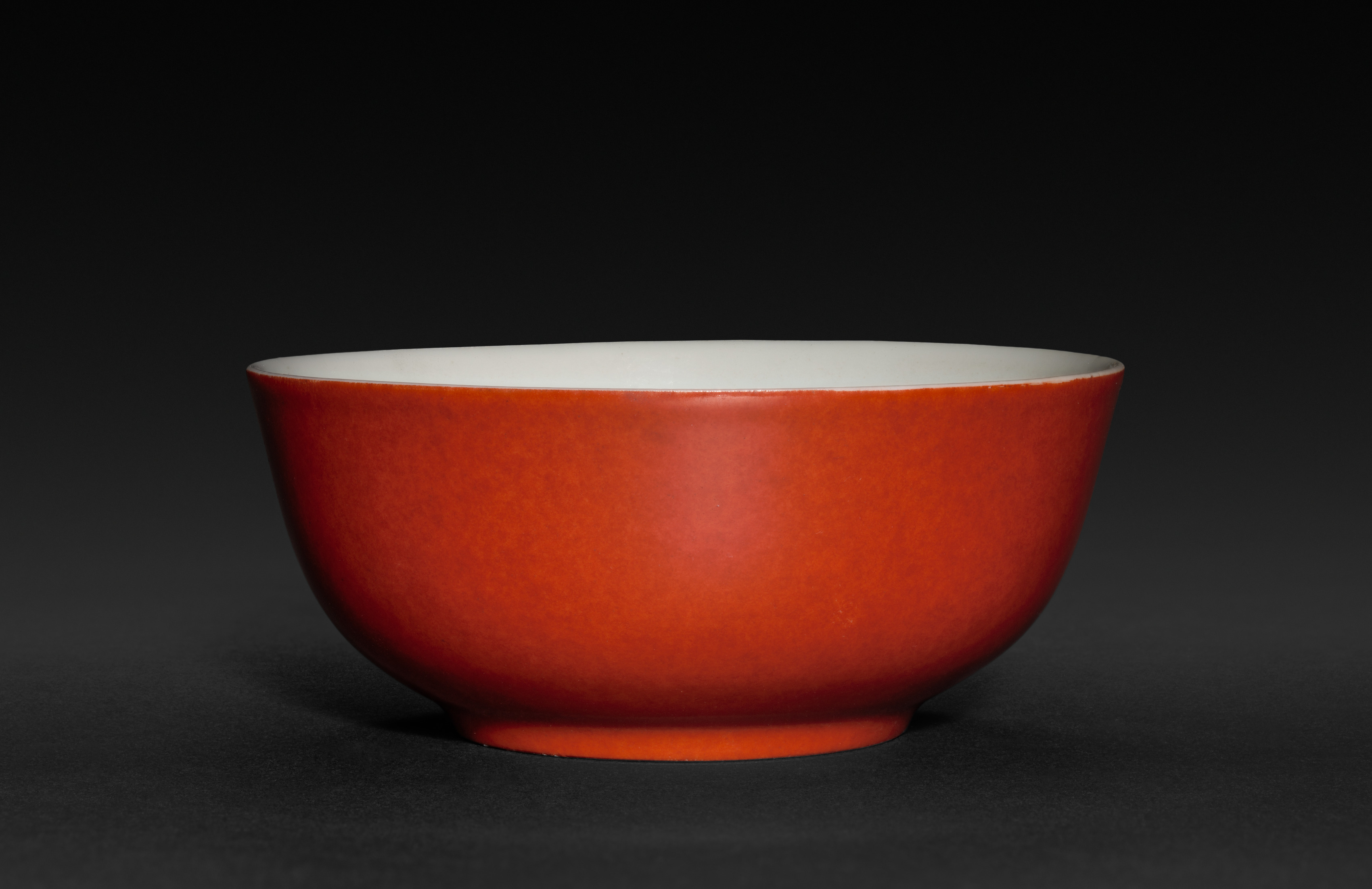 Red bowl with white interior, rounded body and narrow base, by artist unknown as titled "Bowl".
