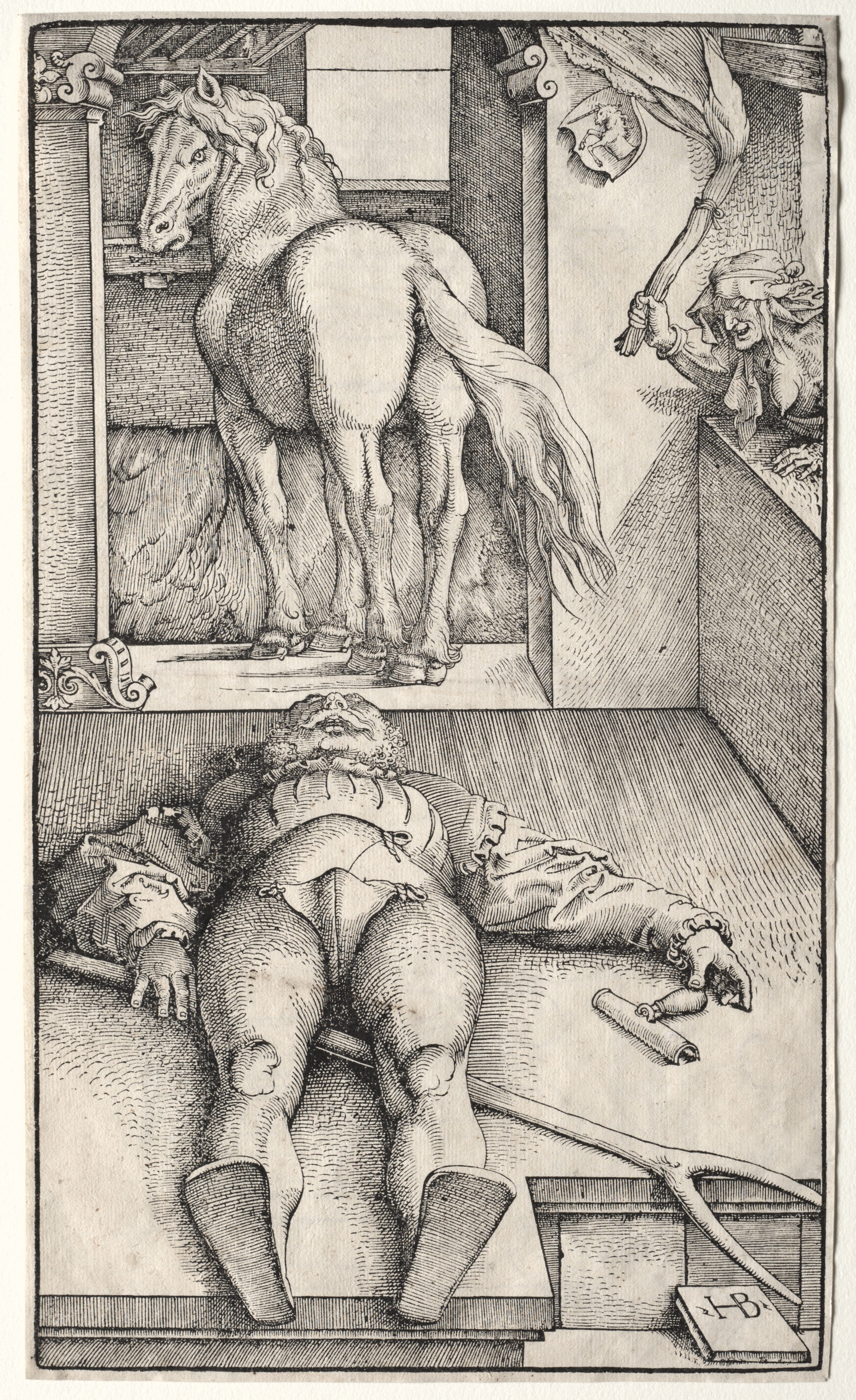 The image depicts a black and white drawing divided into two sections. The top section shows a horse standing in a stall, with its head turned to the left and its tail to the right. The horse faces left and has a long mane. A witch peers down from the right side of the stall. The bottom section shows a man lying on his back on a table with his head tilted back. He wears a hat, shirt, pants and boots. His arms are stretched out to the sides and a rolled object rests on his stomach. A long object leans against the table on the right. A flat object on the floor near it bears an indistinct marking.