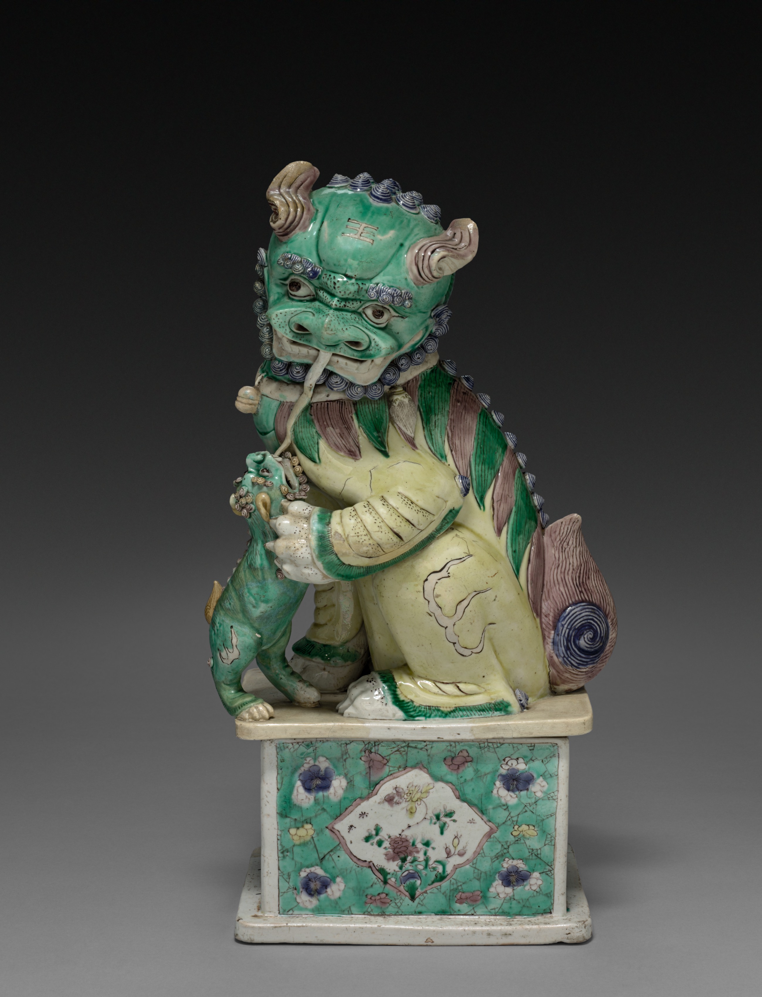 Green and beige ceramic statue of a lion sitting on a rectangular base. The lion has a large head with two horns on top and a long snout and tusks. The body is sitting upright with one arm bent at the elbow and holding something small. A small green and beige lion on the left. The base has a floral design in shades of green, blue, white, and pink. The background gradient transitions from black to gray. Title: Lion Artist: Unknown