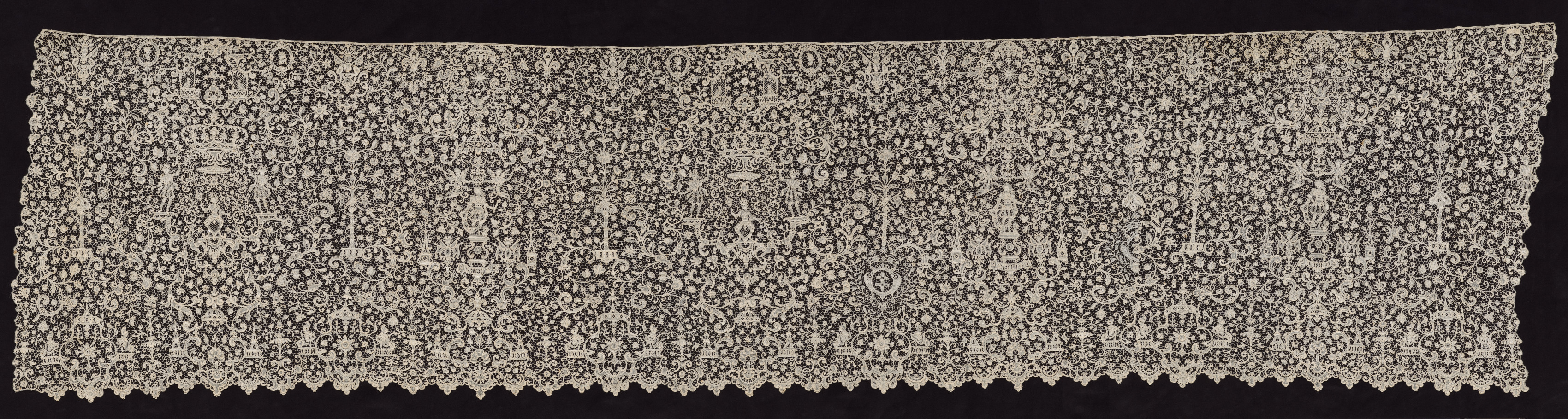Rectangular piece of off-white lace with intricate floral and geometric patterns; zig-zag edge along bottom; symmetrical design with repeating shapes; solid black background; titled "Lace Flounce".