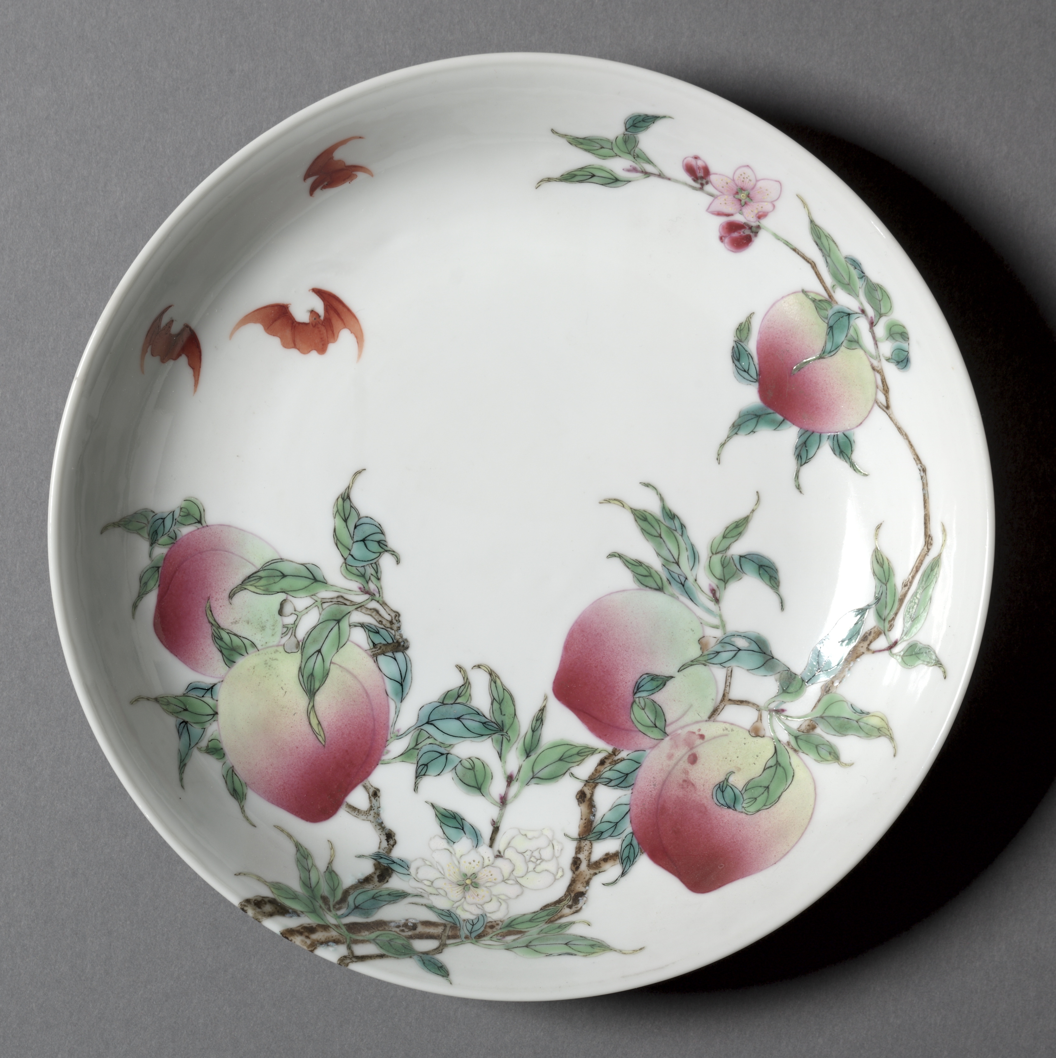 White porcelain dish with rounded rim. Inside of dish has a design featuring a tree branch across the bottom and up the right side. The branch has green leaves and pink and white flowers. Attached to the branch are five pink and green peaches. Three brown bats are scattered on the top left side. The background of the image is gray.