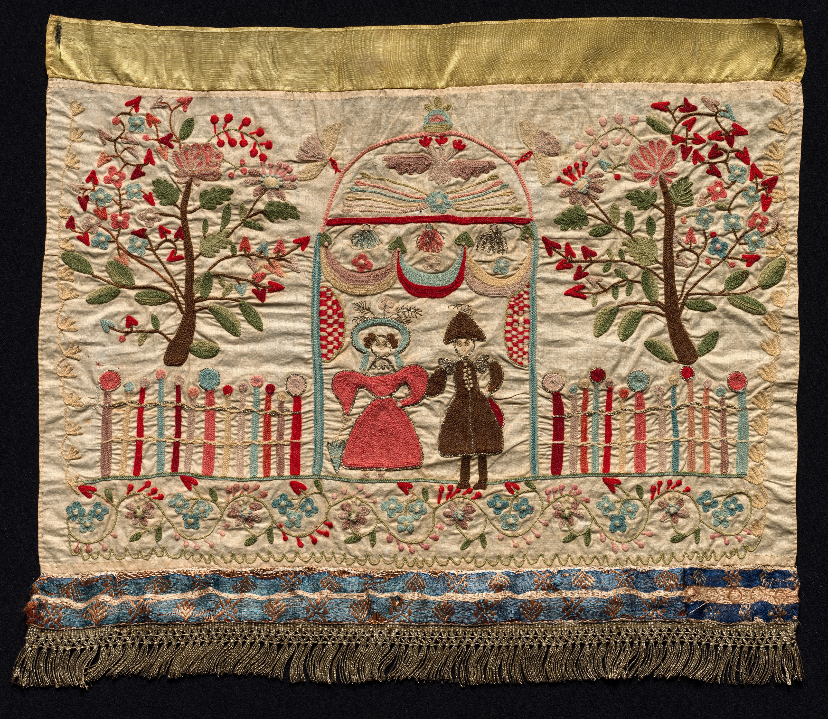 Towel end, by an unknown artist. The image shows a square piece of fabric with a decorative design. The top has a gold-colored strip. The main section is white with embroidered designs including two trees with red and pink flowers and green leaves on either side of a central arch. Under the arch are two people, a woman in a red dress and a man in a brown outfit. They are standing in front of a fence with a floral pattern below. The bottom has a blue section with brown designs and a gold fringe. The background of the image is black.