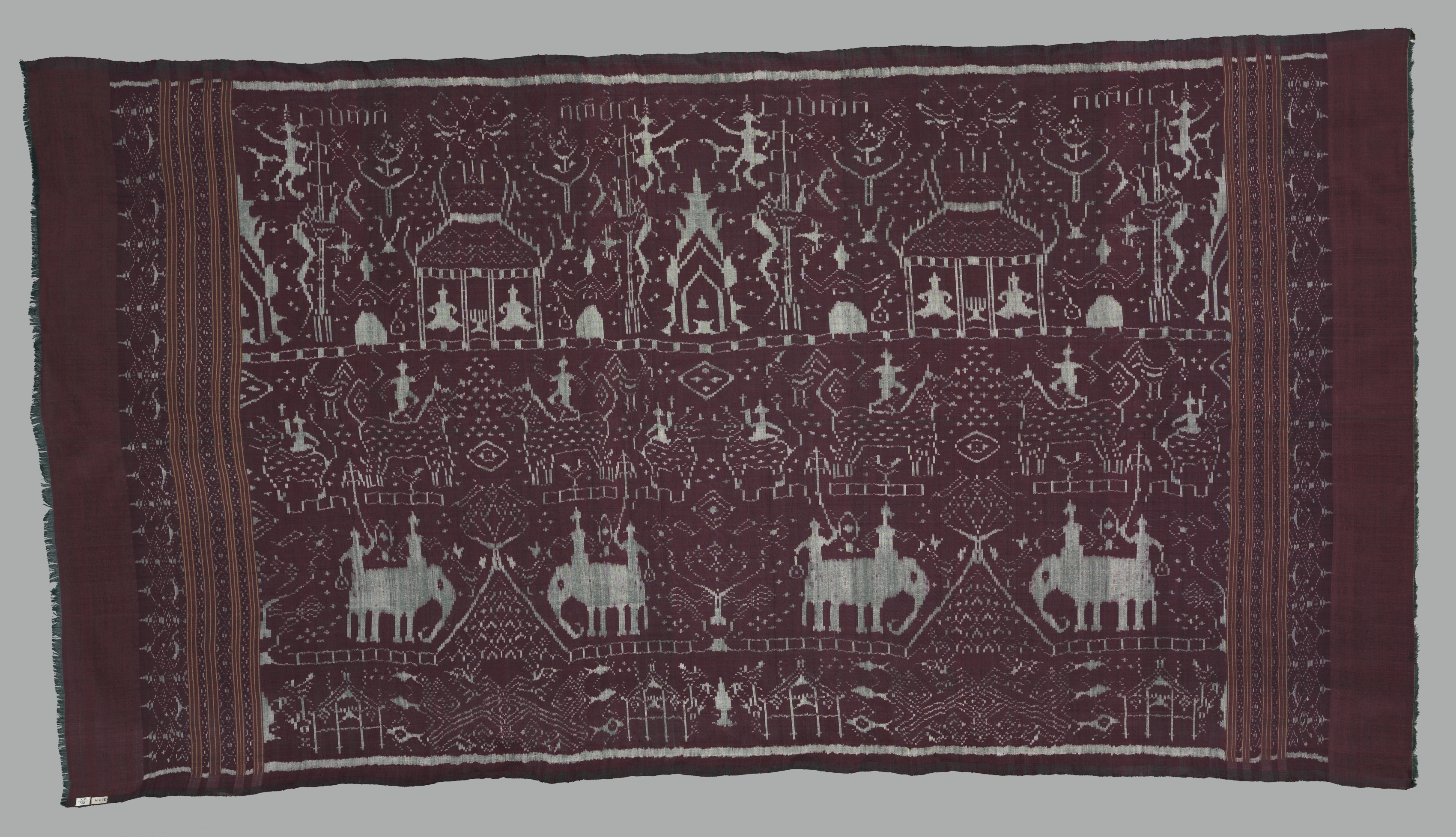 The image shows a rectangular textile with a maroon background and white designs. The textile titled "Sarong" by the artist not specified, has a maroon background with white designs throughout. The left and right sides have a wide maroon border with a narrow patterned strip down the left side. The patterned area has two rows of designs. The top row features various white designs including people, buildings, and animals. The bottom row features white elephants on either side. The textile has a fringe along the top and bottom edges. The background behind the textile is gray.