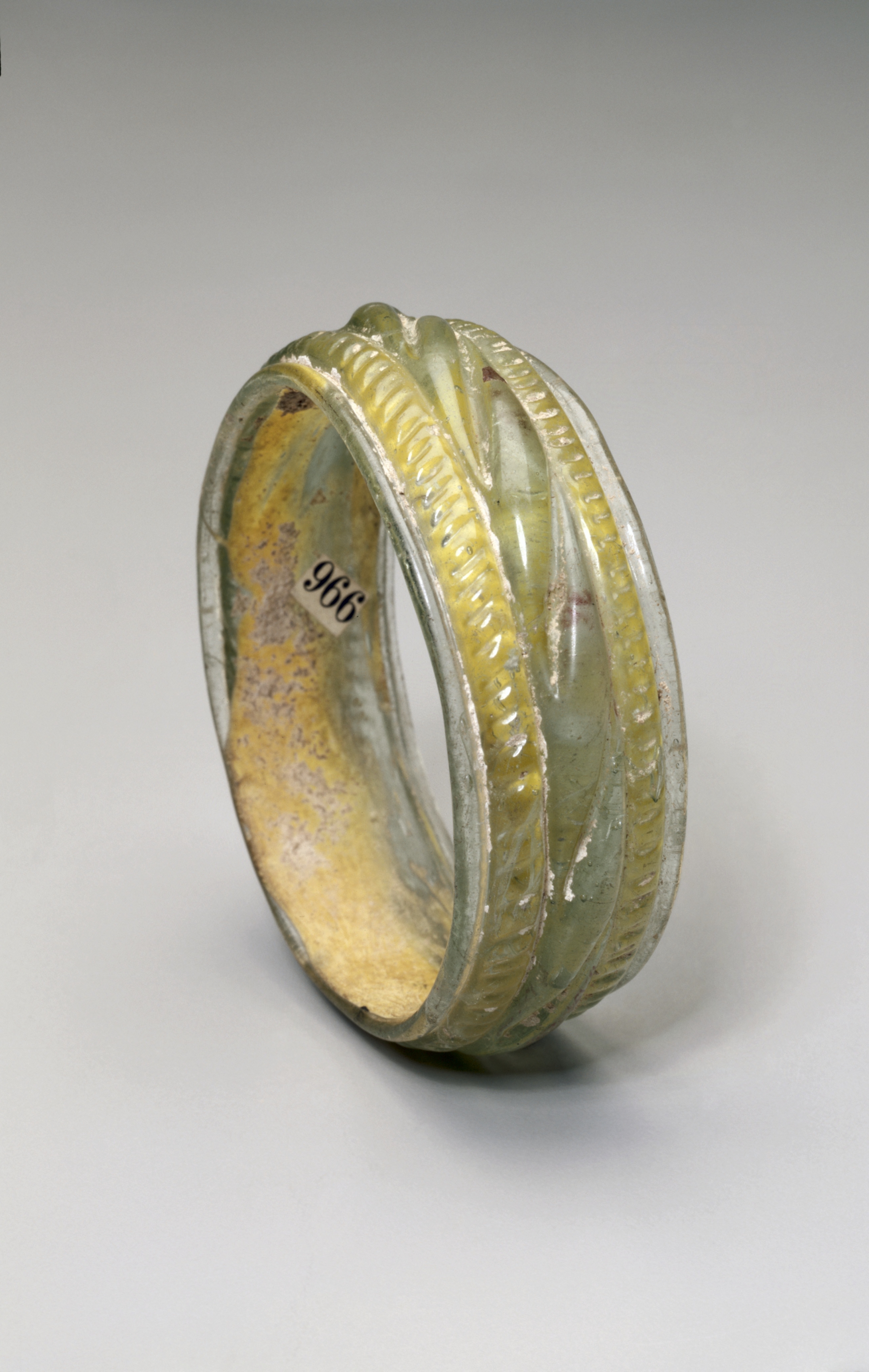 Bracelet by Unknown Artist. A wide, thick bracelet with a rounded rectangular cross-section. The bracelet has a yellow and green glass body with a textured surface. The outer surface features three raised ridges running along the length of the bracelet, with smaller ridges between them. The inner surface is yellow with a rough texture and a small white sticker with the number 966 in black text. The bracelet is displayed on a plain gray background.