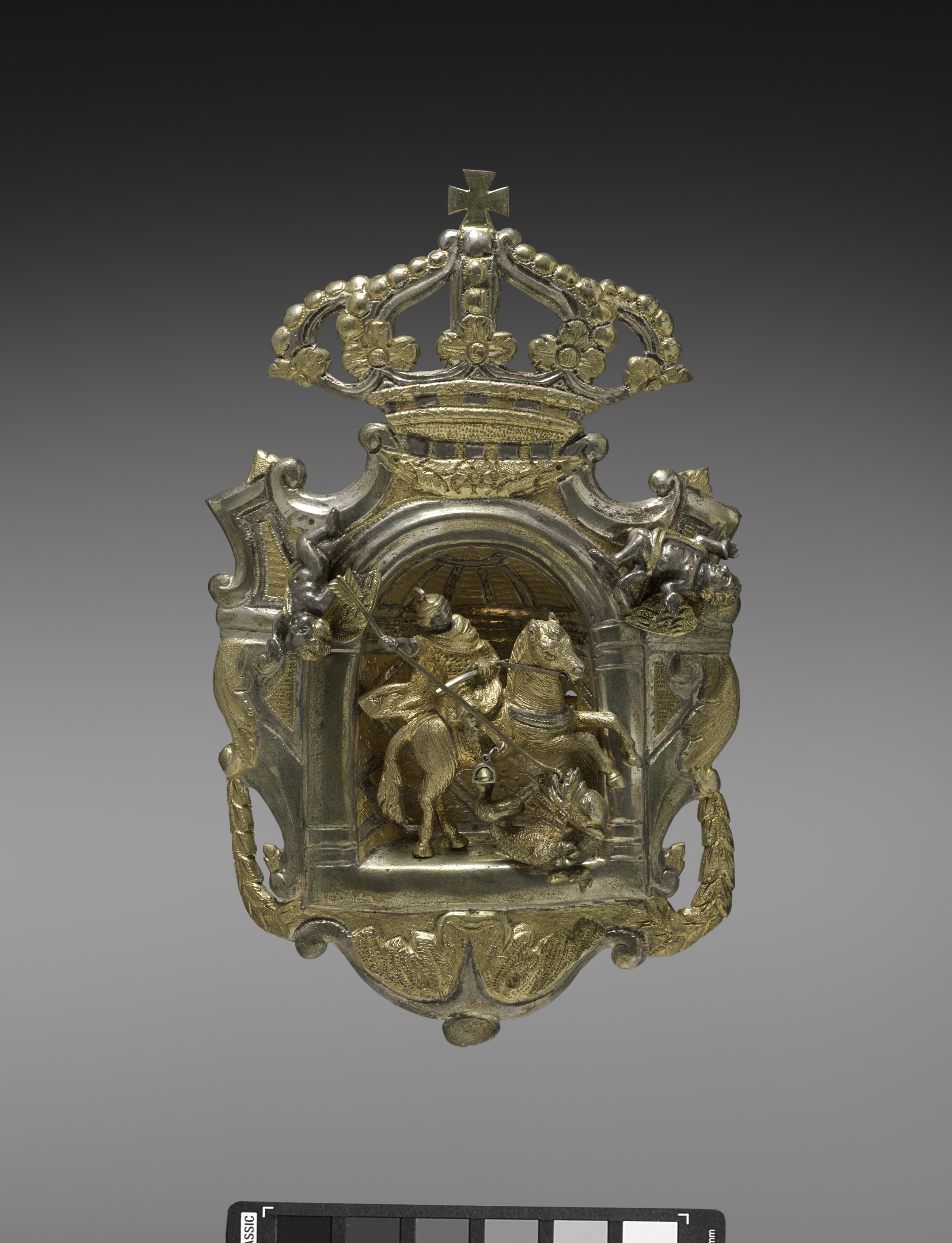 Gold and silver metal belt buckle, rectangular with rounded sides and a crown on top. The buckle has a raised scene of a man on horseback with a spear. The man on horseback appears to be fighting a dragon or other mythical creature. The frame of the buckle has ornate designs on the sides that include leaves and curled tendrils. The top of the buckle features a crown. The background of the image features a gradient that goes from dark gray at the top to light gray at the bottom. A color palette scale is located at the bottom. The buckle is by an unknown artist and is titled "Woman's Costume (Metal Belt Buckle)".