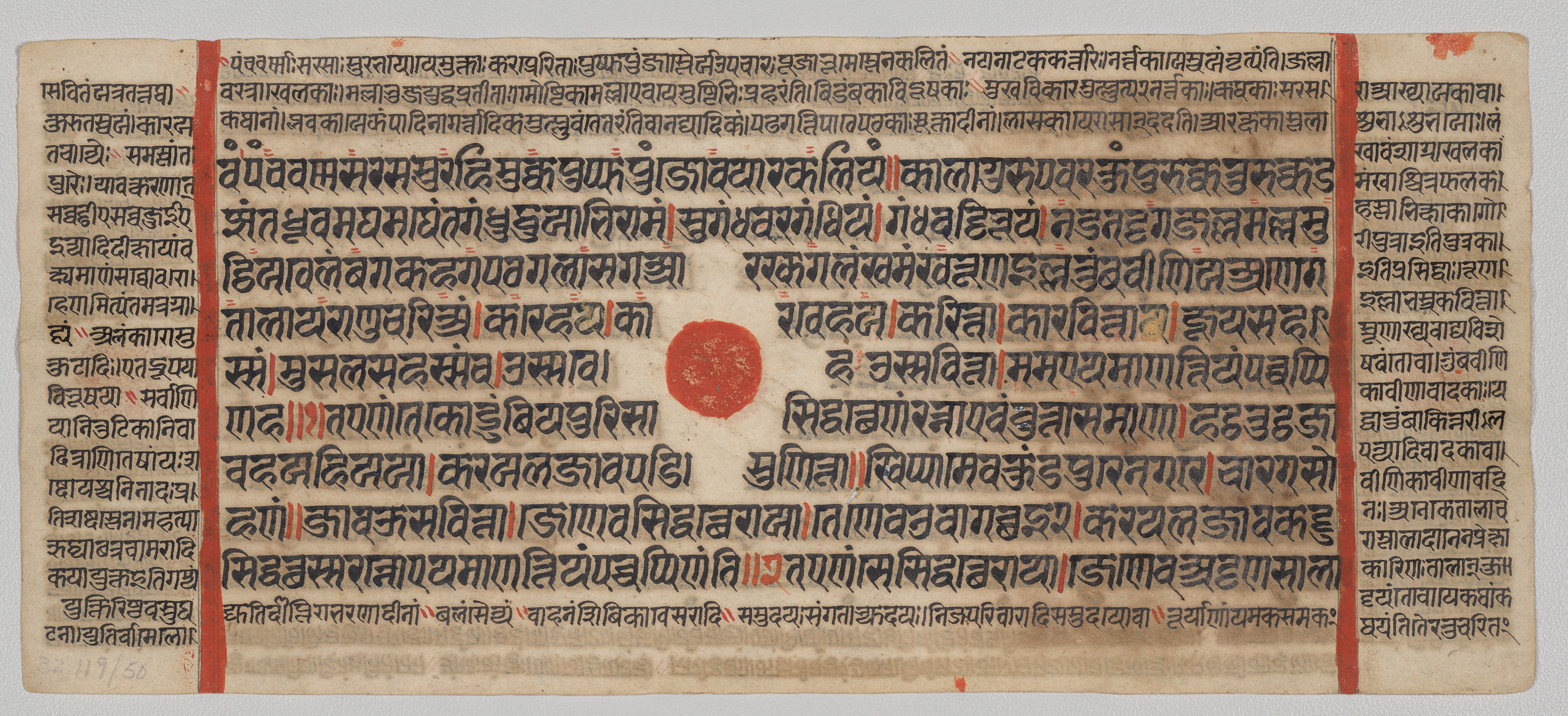 A page from an old book with writing in a language that uses non-Latin characters. The page is rectangular. The background of the page is off-white and yellowed. There are two vertical red stripes, one on each long side. The writing on the page is black and fills most of the page. The writing is arranged in lines that go from left to right. There is a large red circle in the center of the page. The edges of the page are rough and worn.