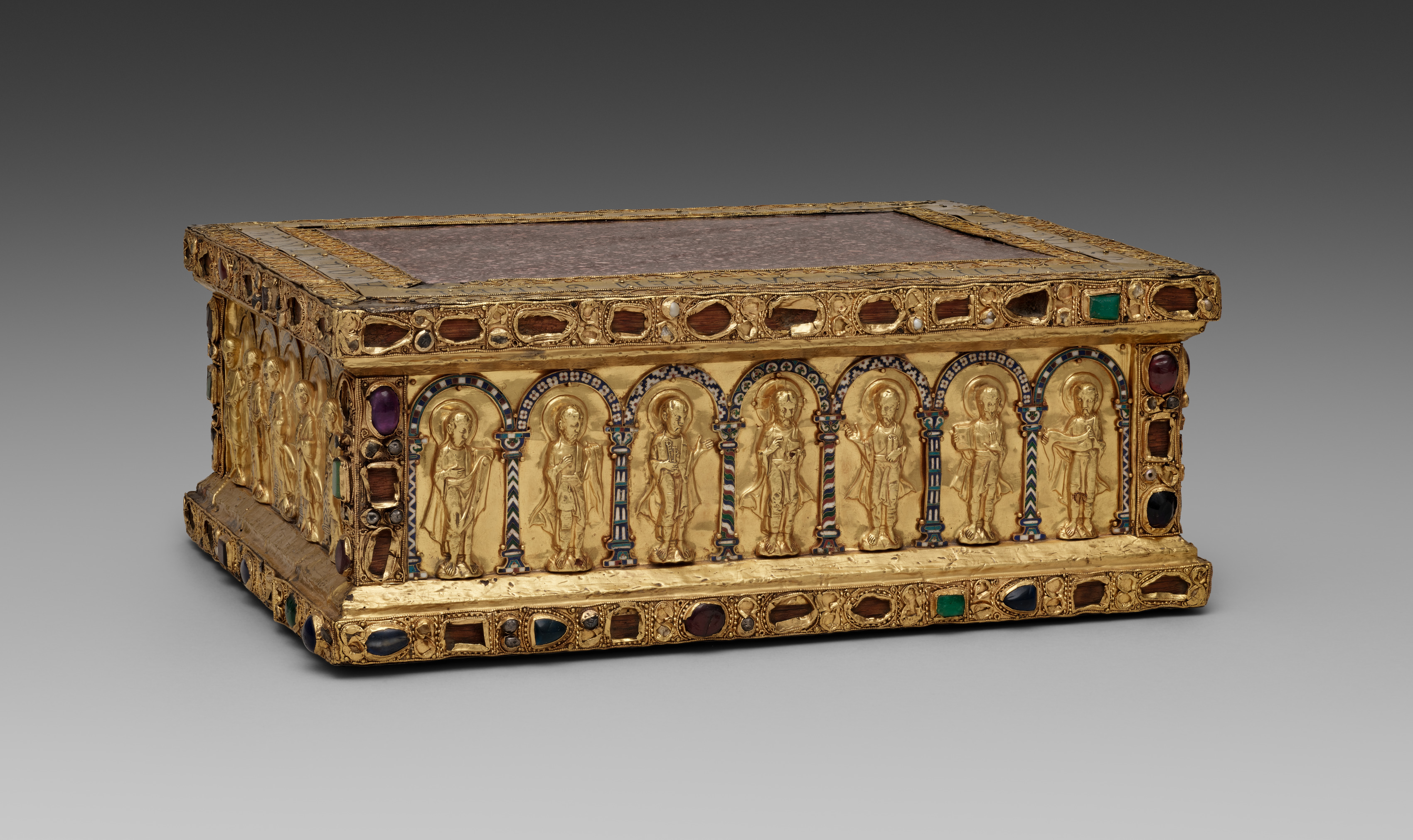 The Portable Altar of Countess Gertrude is a gold-colored, rectangular box with a flat top. The box features a raised border around the top edge and a flat base. The top surface is covered with a mosaic pattern and bordered by gold. The front and sides are adorned with ten vertical panels featuring gold figurines of saints beneath a halo. The panels on the sides and front are outlined in blue. The box's surface is decorated with numerous small, oval and square gemstones in various colors including purple, green, brown, and clear. The gemstones are set into gold settings along the top and bottom edges and on the sides. The background of the image is gray.