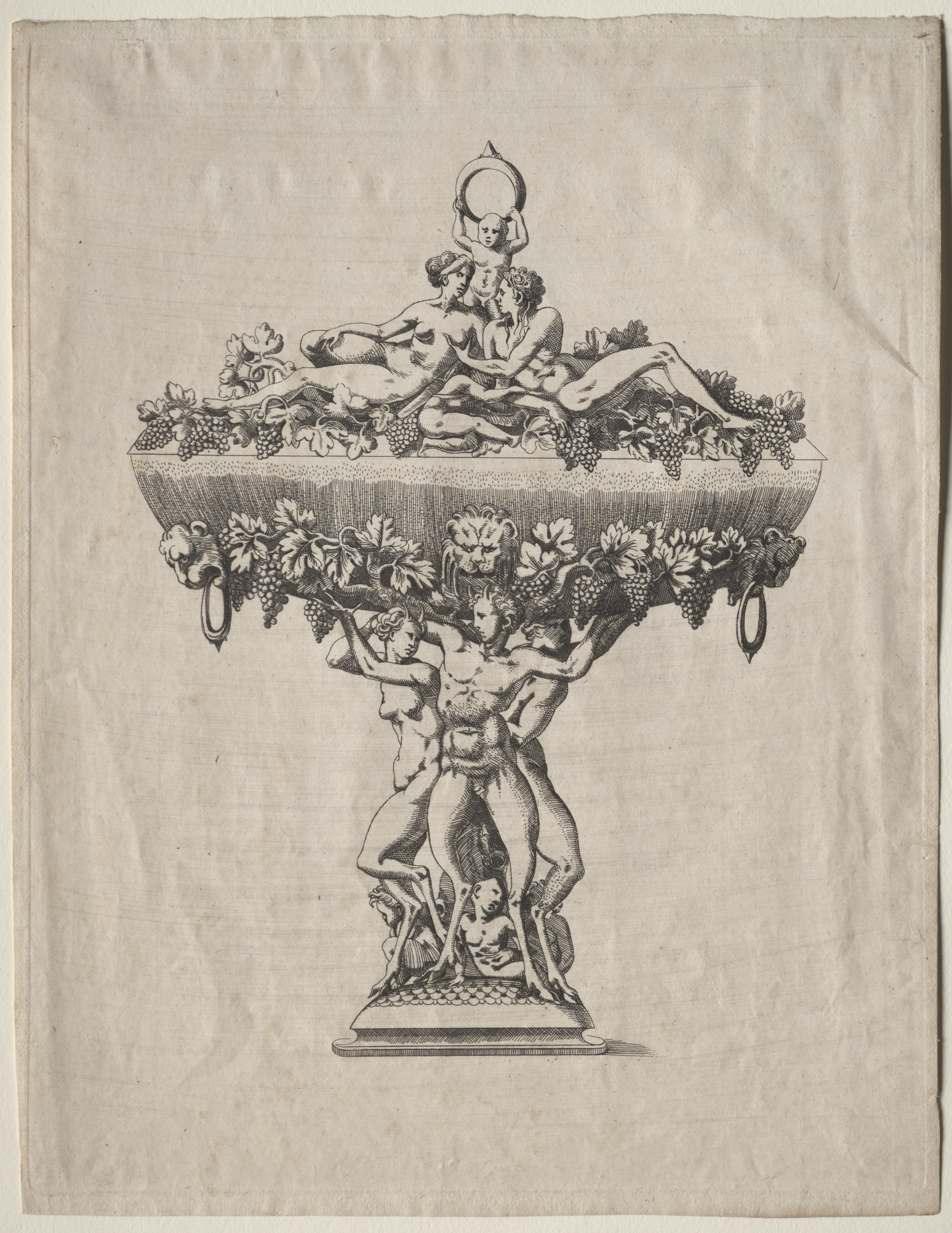 A covered cup with a wide bowl and a pedestal base supported by three nude male figures. The bowl is adorned with a garland of grapes and leaves. A nude male and female figure recline on top of the bowl amidst more grapes. The male figure holds a round object over his head. The pedestal base features a decorative design. The entire image is in black and white.