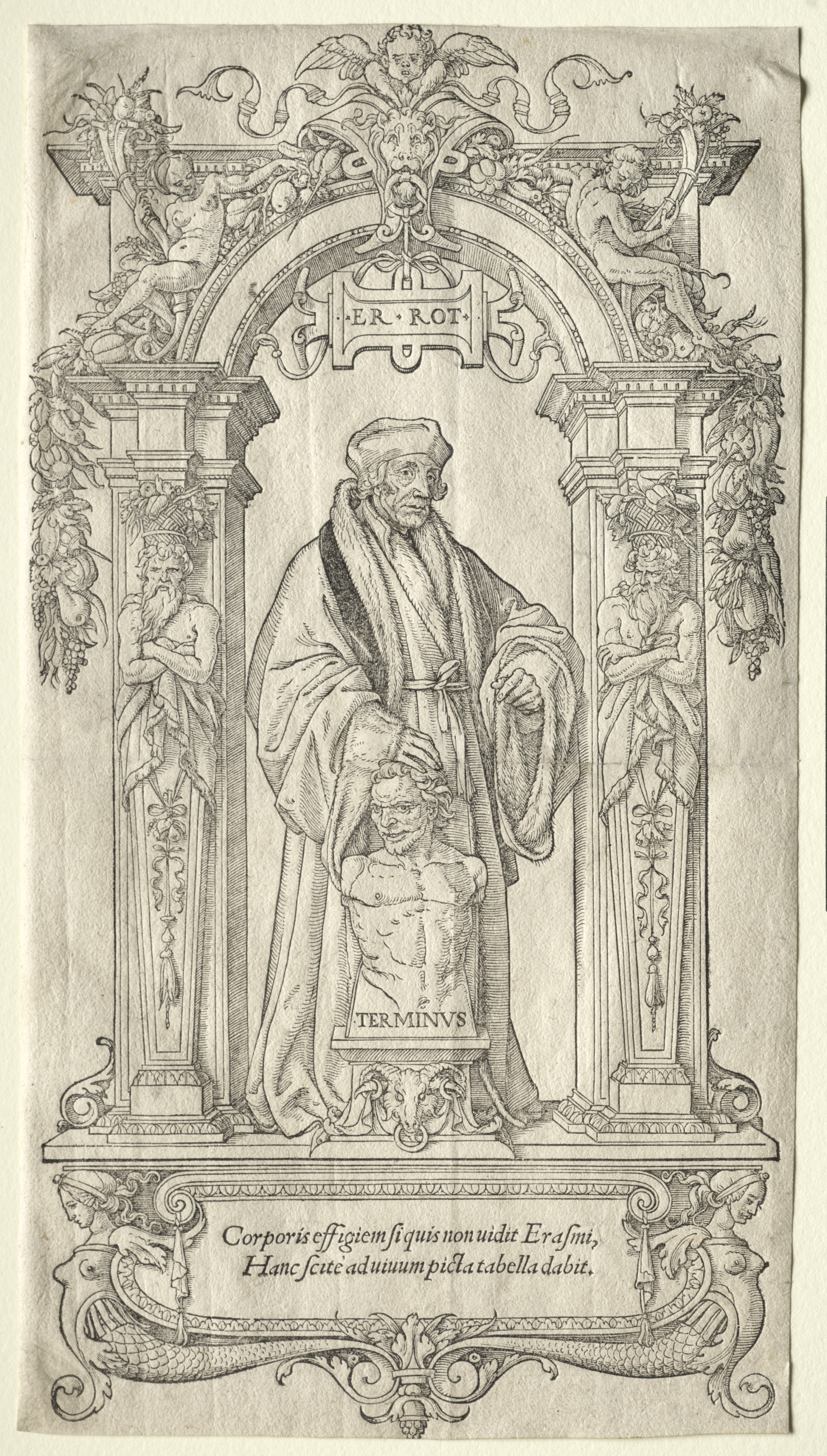 An older man wearing a hat, robe, and cloak stands in an ornate archway. The man holds a cloak in one hand and touches a bust on a pedestal with the other. The pedestal bears the inscription "TERMINVS". The archway features columns on either side with carved figures. A carved figure sits on top of each column. The arch has decorative elements, including leaves and a ribbon. The background of the image is off-white and textured like paper. Latin text is written at the bottom. The overall composition is detailed and ornate.