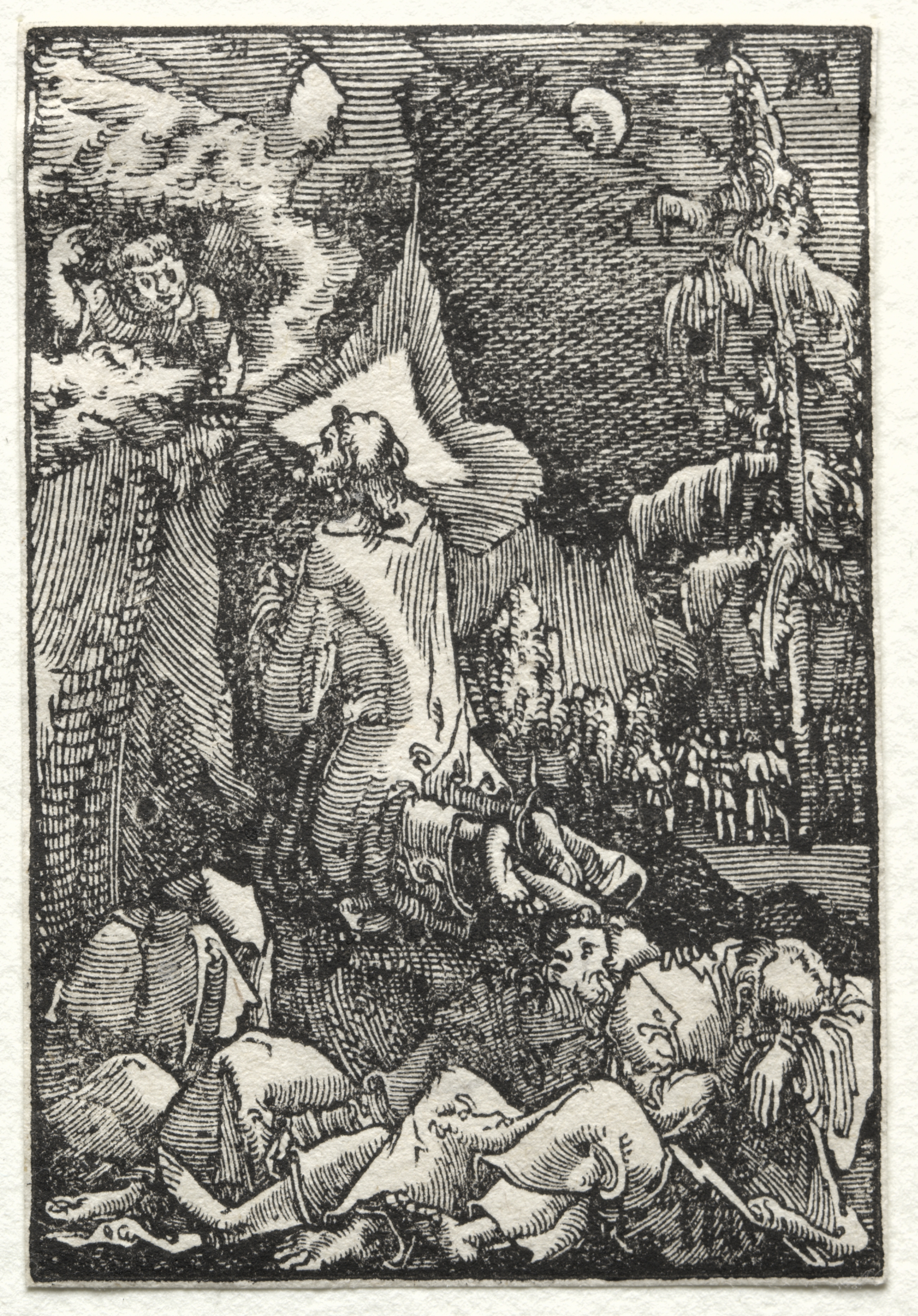 Black and white image of a kneeling man in the center surrounded by three sleeping men; an angel hovers above him on the left; a full moon is on the top right; trees are on the right; the sky filled with lines suggestive of wind; a crowd of people is on the right in the background.