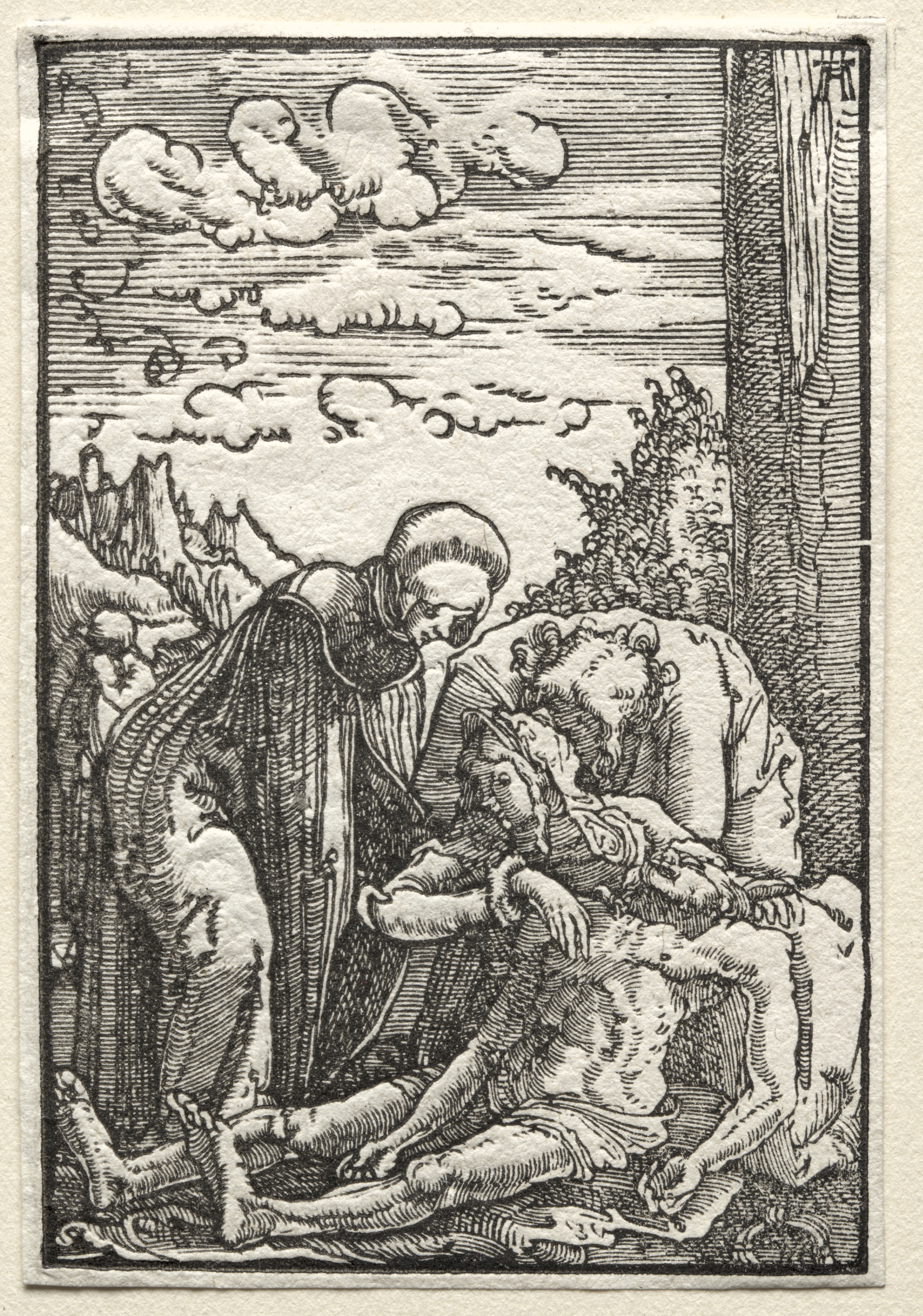 The image depicts a black-and-white woodcut of a scene with a man in a cloak standing over a prone figure, with another figure to the right. The standing man has a halo and holds the head of the prone figure in his hands. The prone figure is nude and appears to be dead or dying. The figure to the right is shirtless and appears to be mourning. The background shows a sky with clouds and a mountain range. A tree trunk is visible on the right side. The scene is framed by a border, and the image has a textured appearance. There are no people or objects in the immediate foreground beyond the figures. The overall scene appears to be a lamentation or mourning scene.