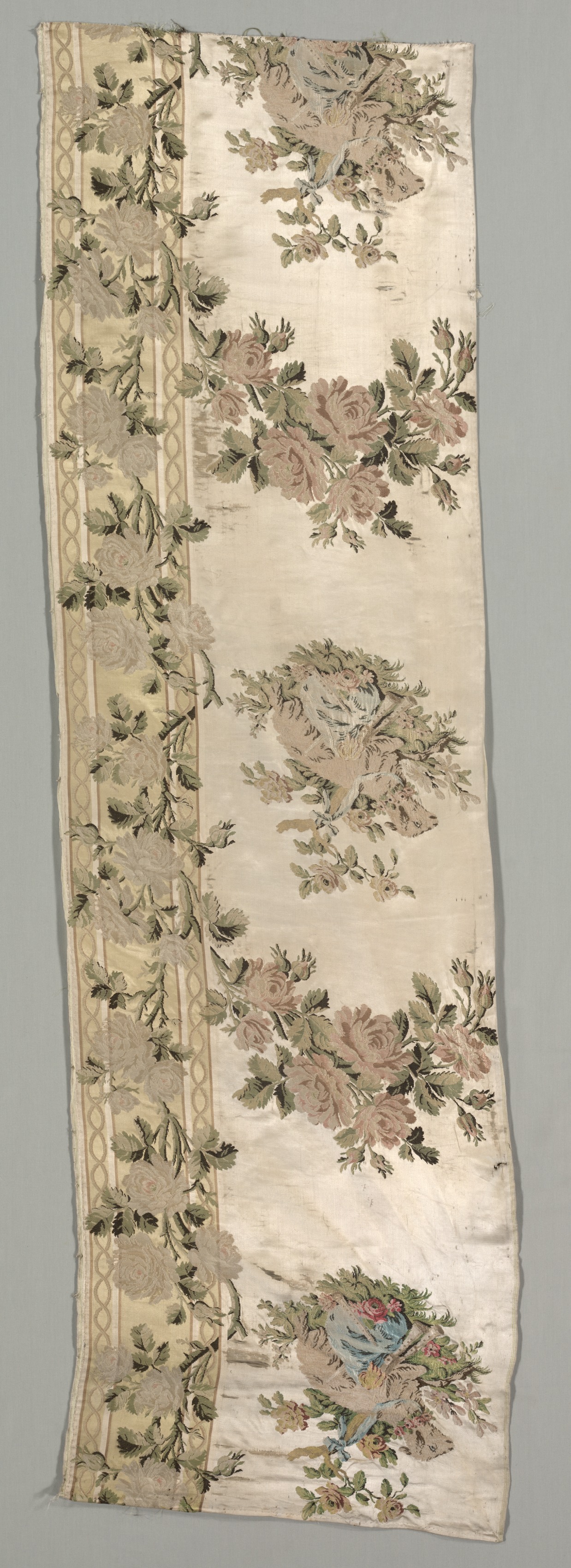 Length of Brocaded Satin by Philippe de Lasalle. The image shows a long, narrow piece of fabric with a floral pattern. The fabric is primarily cream-colored with a wide border on the left side featuring a tan background and a repeating design of interlocking ovals. Inside the border, a repeating pattern of bouquets of flowers and leaves in shades of pink, green, and blue is visible. The fabric appears to be made of satin and has a brocaded design. The background behind the fabric is gray.