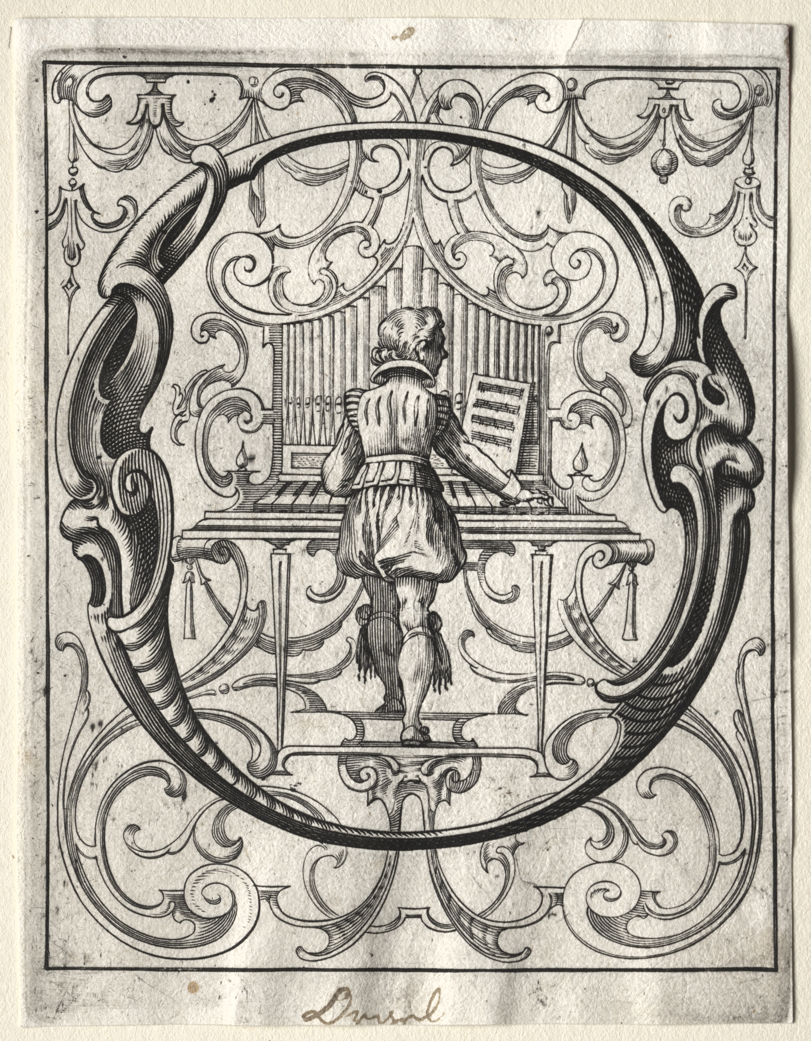 Black and white illustration of a large letter O. A man wearing a short tunic and boots stands at a harpsichord. The letter O frames the man. He has short hair and his back is turned to the viewer. The letter and man are surrounded by a square ornate border.