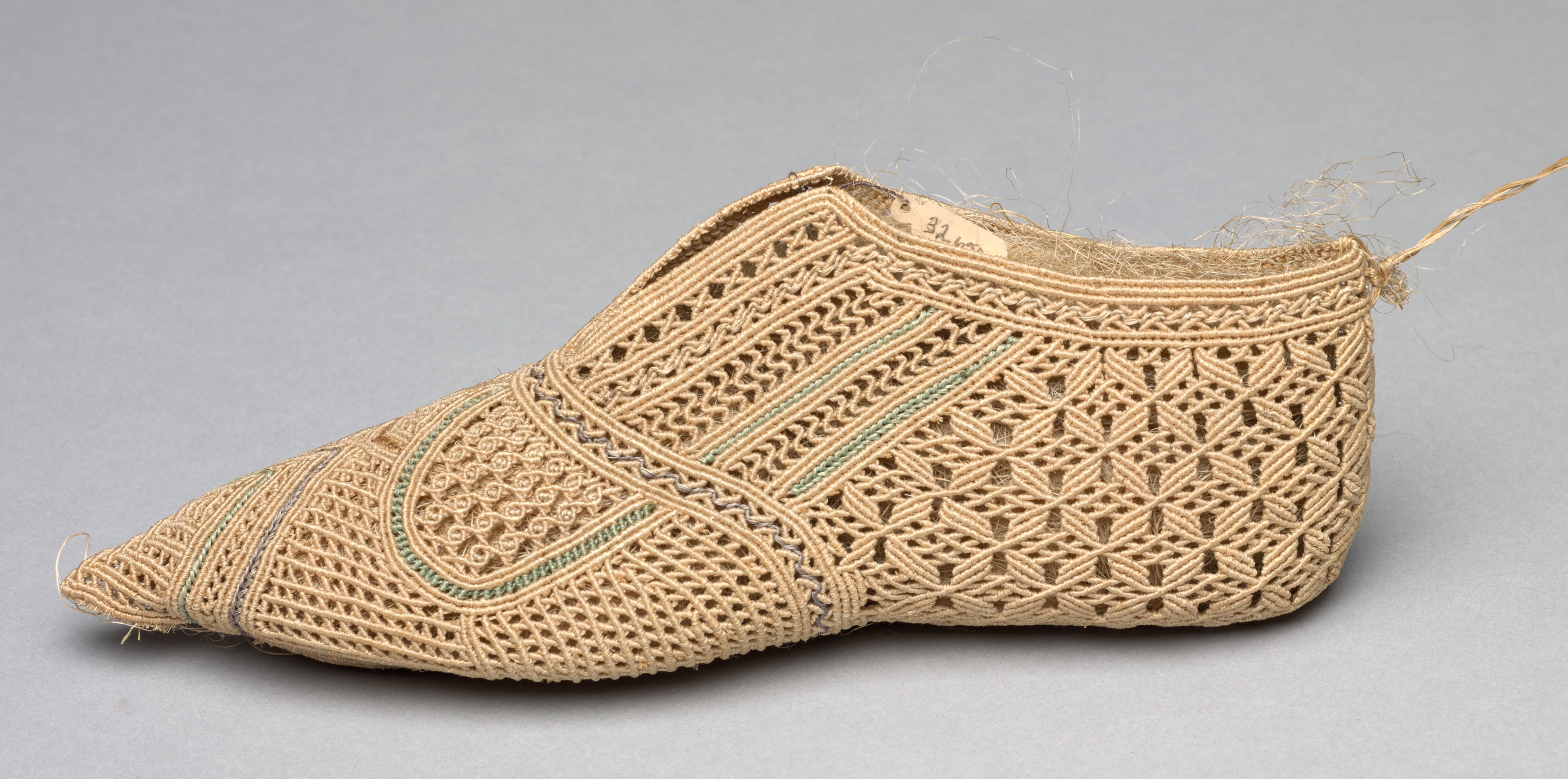 The image shows a shoe by artist unknown titled "Shoe". The shoe is made of woven material, possibly straw or grass, and features a tan color with green accents. The shoe has a pointed toe and appears to be a women's shoe. It is lying on its side with the toe pointing to the left. The upper part of the shoe is made of woven material with a pattern of interlocking diamonds and circles. There are two green stripes running along the side of the shoe, one near the toe and one near the heel. The heel of the shoe is rounded and has a small piece of string or twine attached to it. The background of the image is a plain gray color.