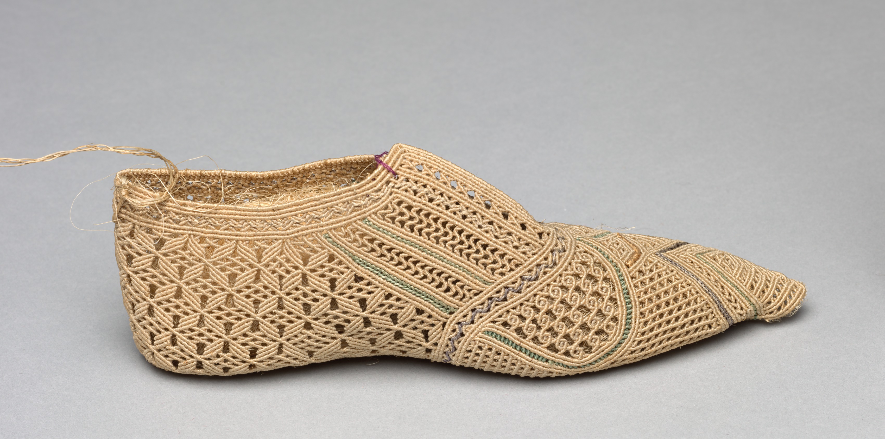 The image depicts a woven shoe titled 'Shoe' by an unknown artist. The shoe is made from natural fibers, likely straw or wicker, and features an intricate woven design. It has a pointed toe and a low heel. The upper part of the shoe is woven with a pattern of interlocking lines and shapes. A thin thread extends from the back of the shoe. The shoe is positioned on a plain gray background.
