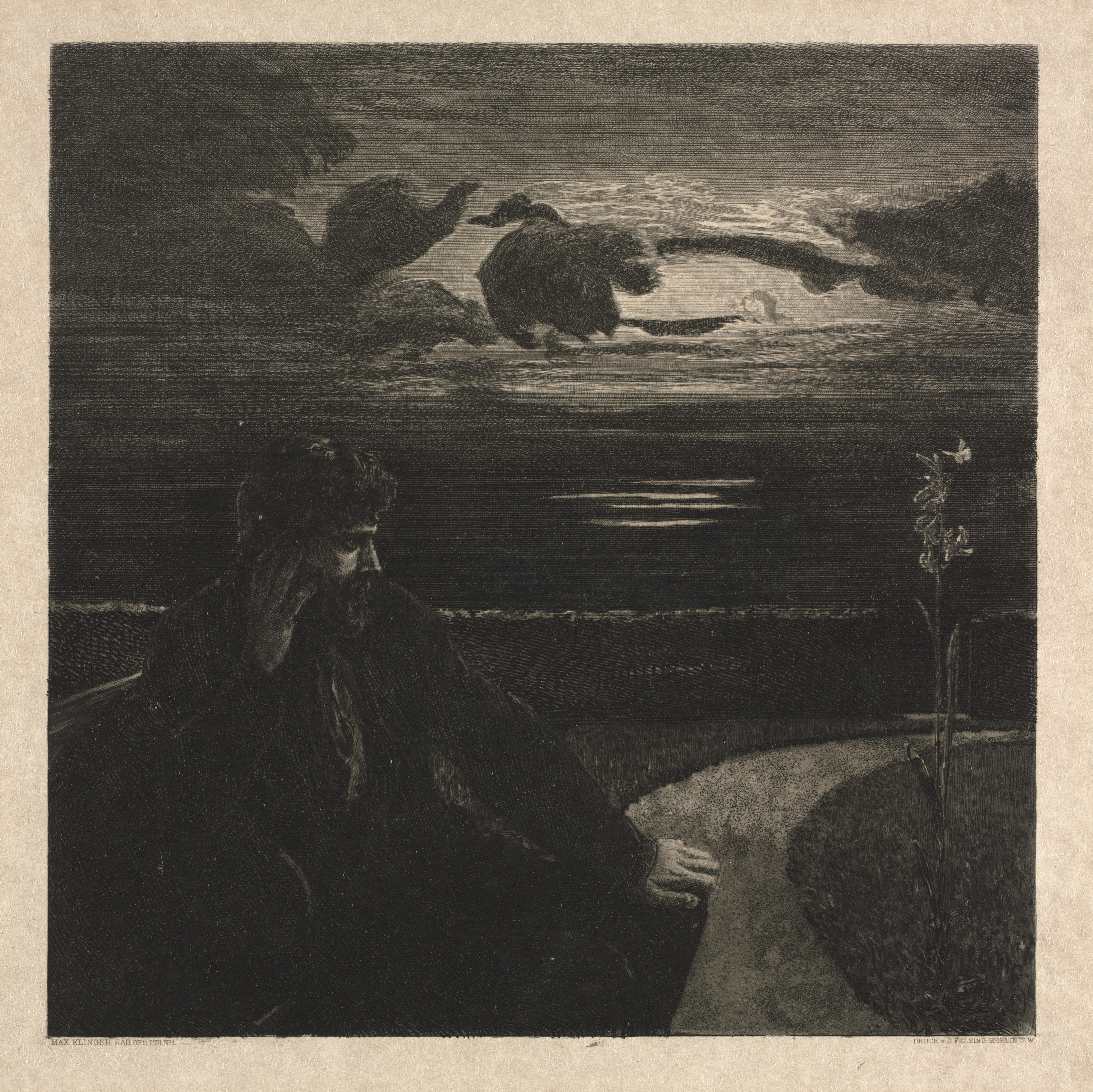 Black and white artwork of a man sitting on a bench. The man has short hair and a beard. He is sitting on a bench on the left side of the image and looking to his right. He wears a dark jacket. A flower grows on the right side. There are birds flying in the top center of the image. The background shows a body of water. The sky is cloudy. Title: On Death, Part I. Artist: Max Klinger.