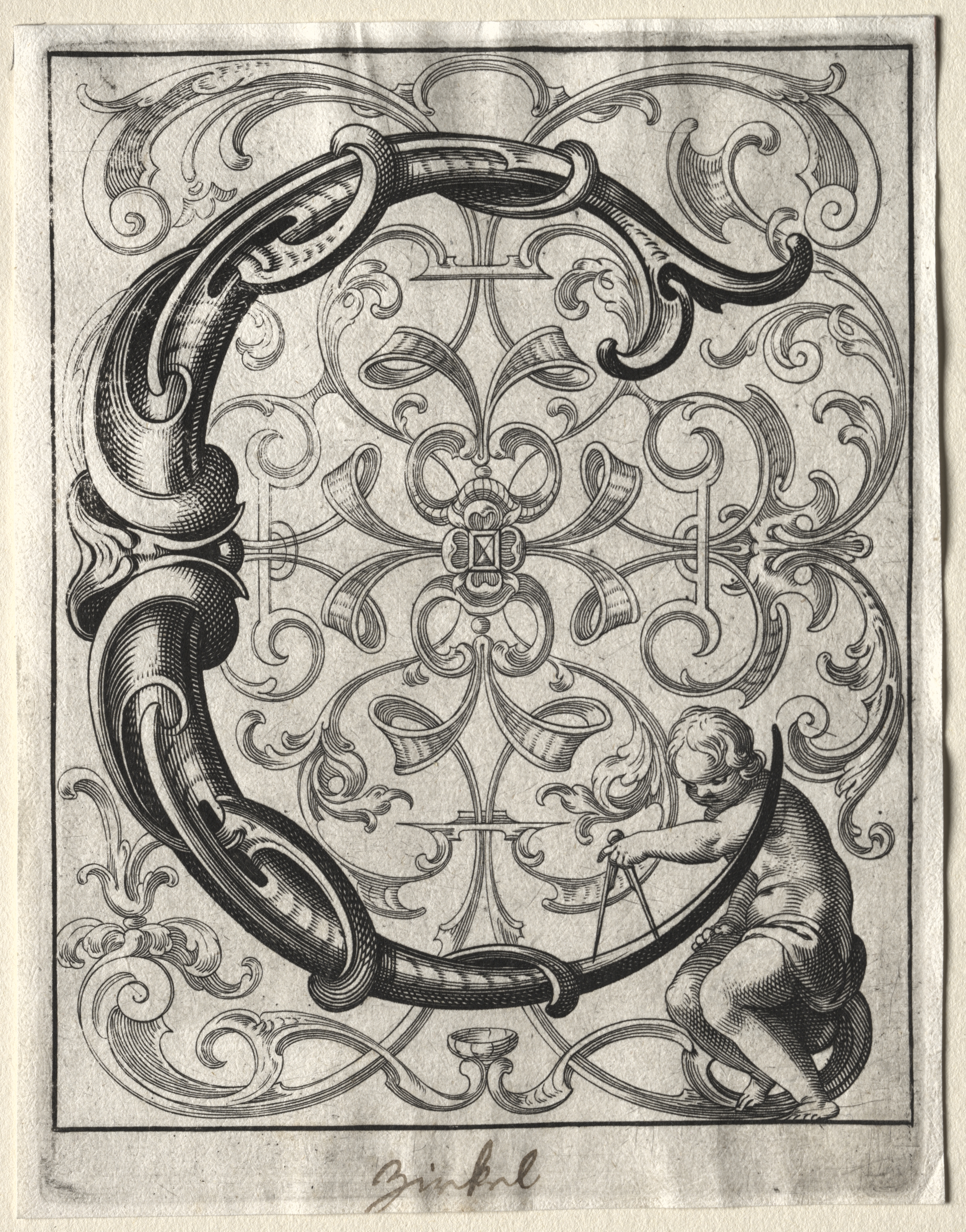 Black and white drawing of a cherub sitting on one knee, holding a bow and arrow. The cherub is positioned at the bottom right, crouched and aiming the bow to the left. The bow curves around and dominates the left side of the image. The background features intricate, swirling designs and patterns. A large, ornate "C" frames the left side. The image is bordered by a thin black line, with a thicker border around the paper. The artist's signature appears at the bottom. The letter "C" is prominent. The style is Baroque.