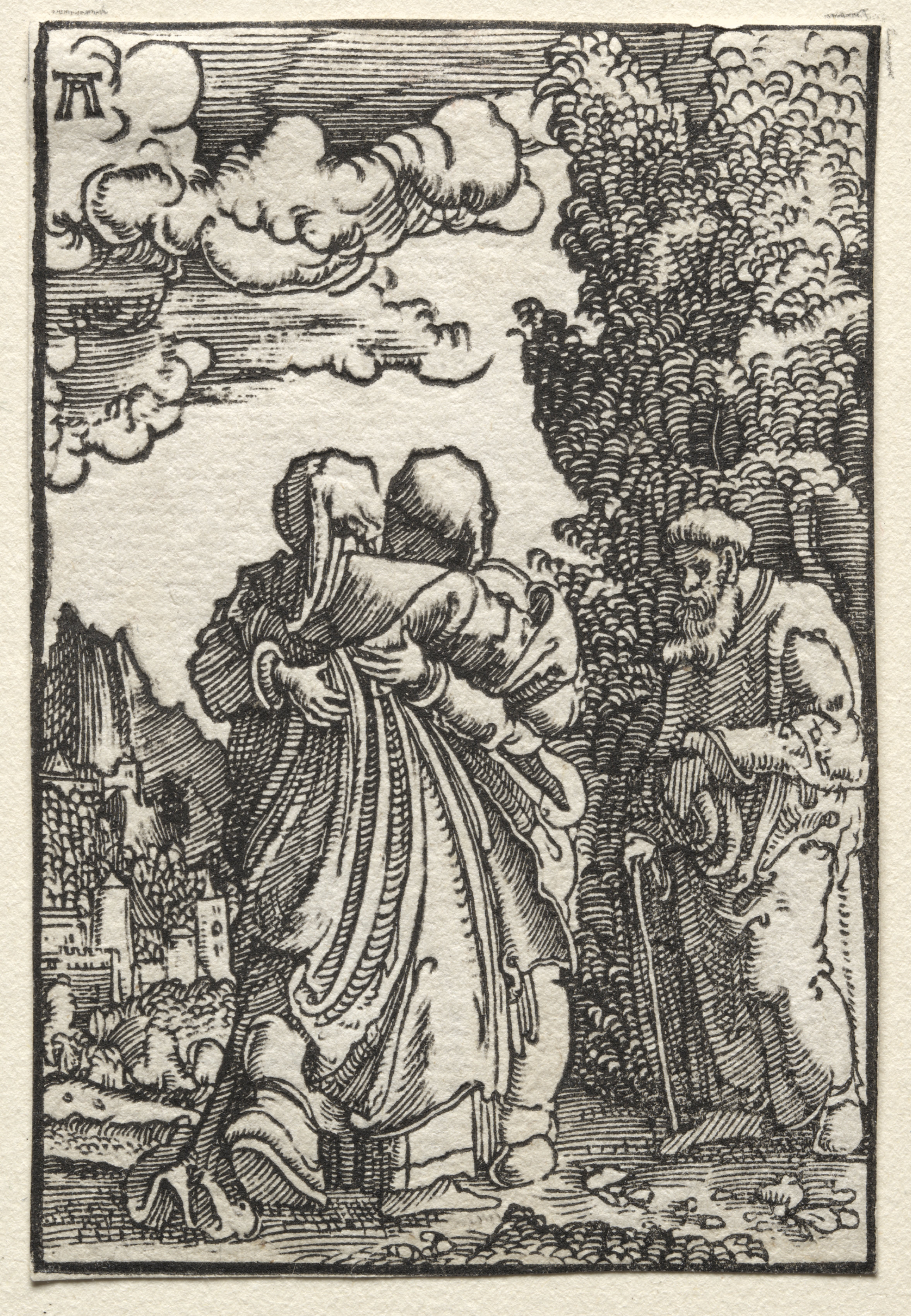 Black and white illustration of a scene with two women and a man. The woman on the left wears a hat and a long dress with a belt. She faces the woman on the right who has her back turned and is embracing a baby. The man on the right wears a hat and a tunic and holds a staff. A cityscape is visible in the background on the left, and trees are on the right. The sky has clouds. The illustration is bordered by a thin black line.