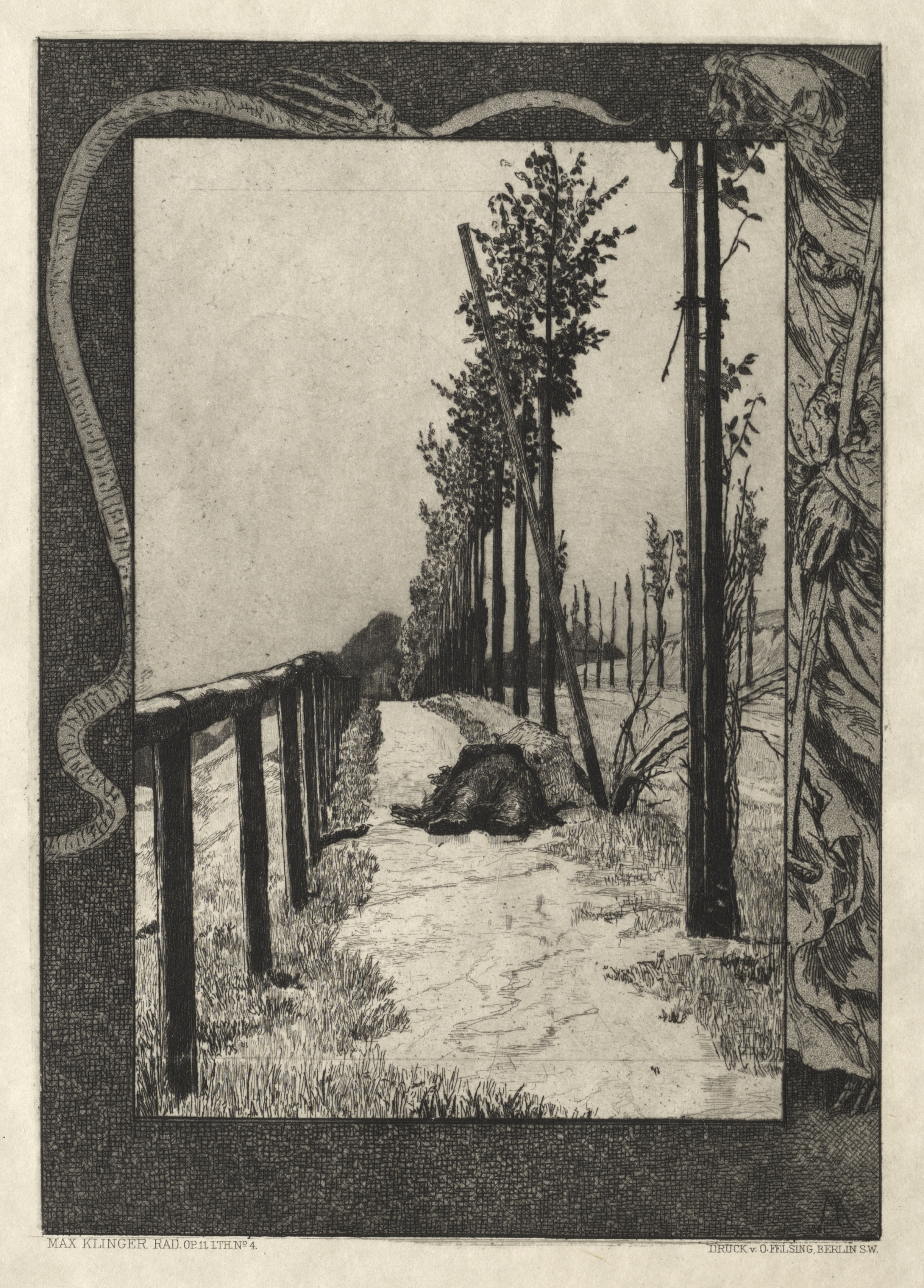 Black and white landscape drawing. A path leads into the distance, bordered on the left by a short fence. Trees on the right side. A large boulder on the path. A serpentine border surrounds the drawing with a darker frame around that. The overall image is sepia-toned.