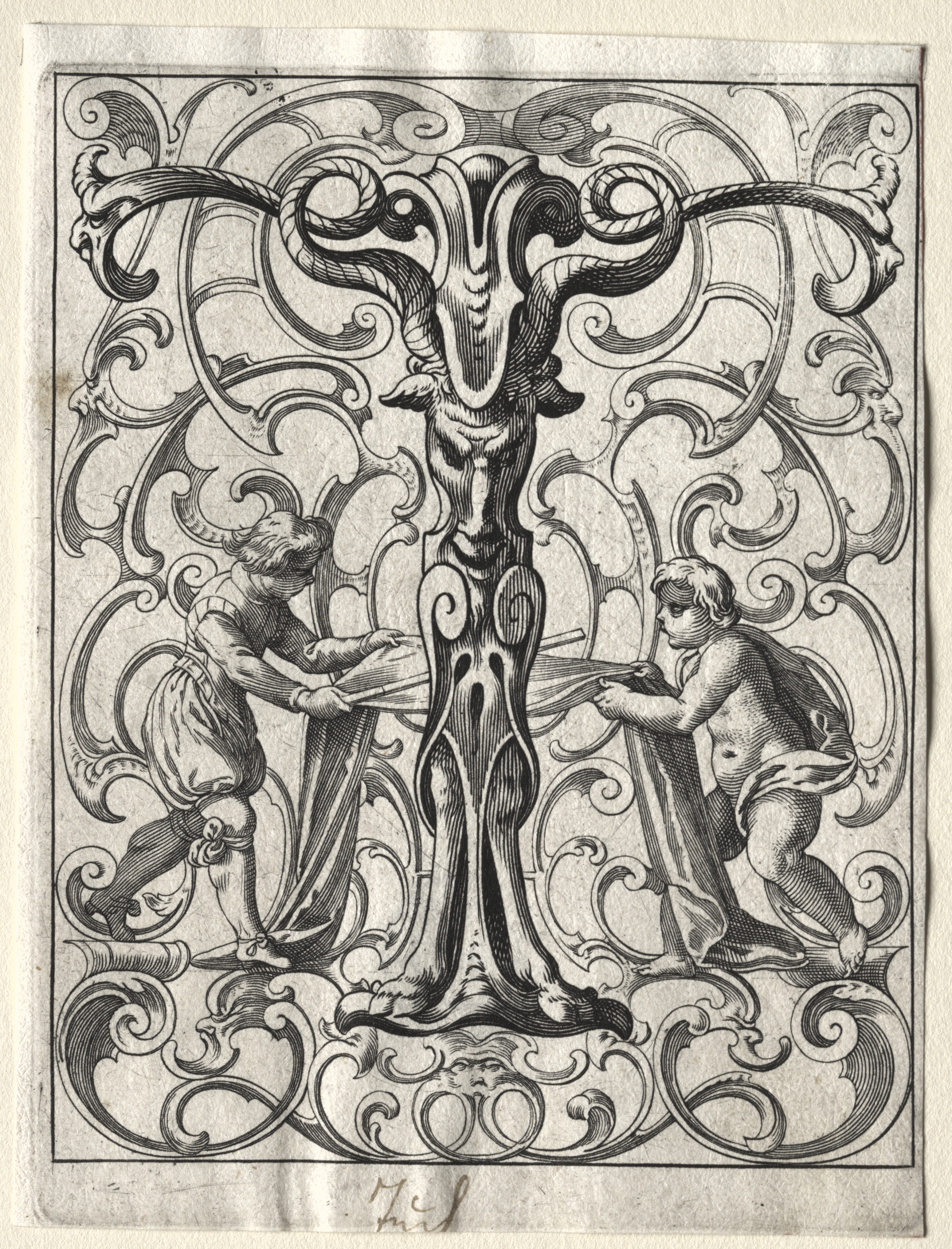 Black and white illustration of a decorative capital T. The capital T is in the center and ornately designed with curvy lines extending from the top bar. Two men are on either side holding the vertical line. The man on the left is clothed and the man on the right is not. The background has curvy scrollwork throughout. The image is bordered by a thin black line and a thick beige border. Title: New ABC Booklet: T. Artist: Lucas Kilian.
