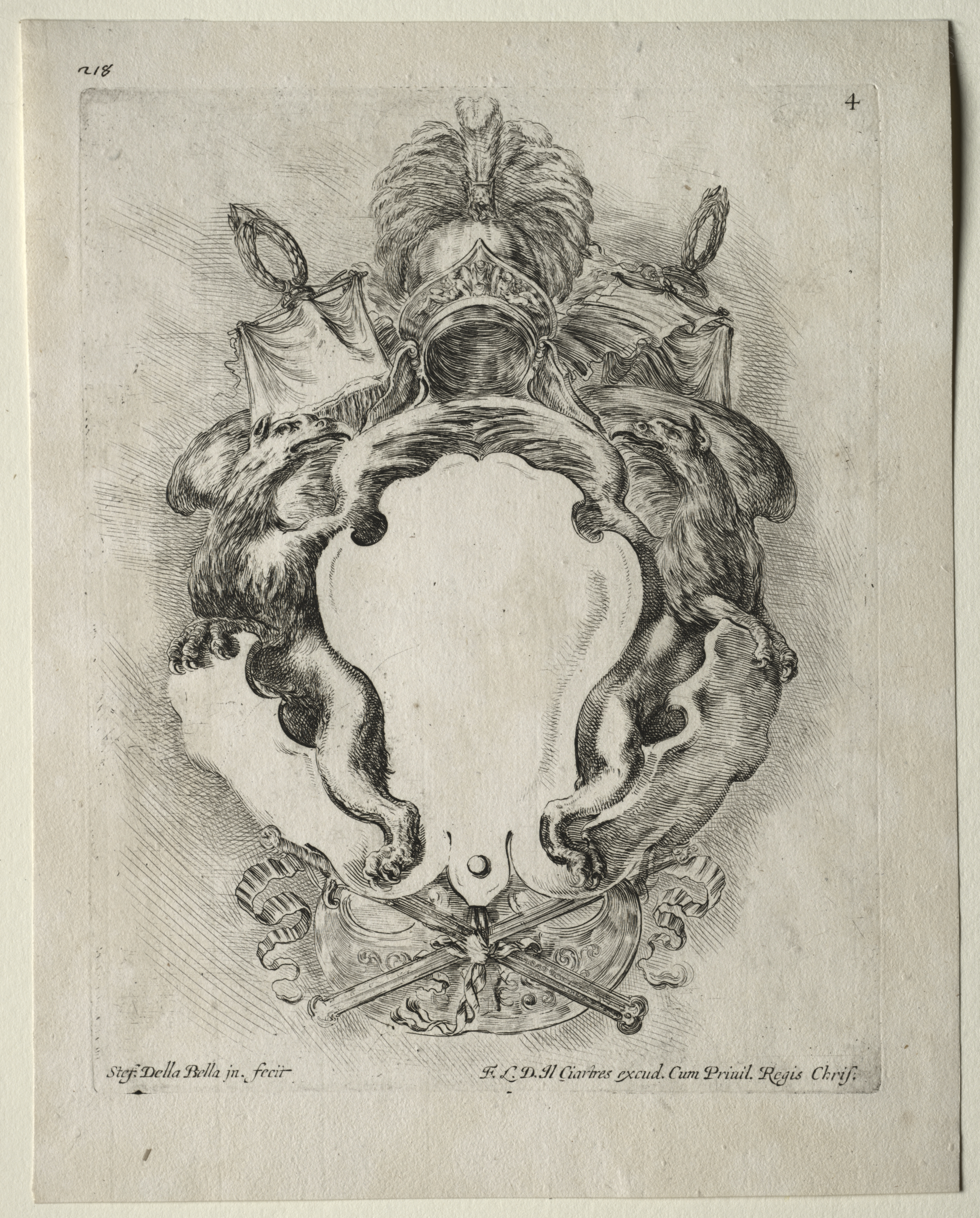 Black and white drawing on aged paper of a cartouche. The cartouche has an empty center and is surrounded by a frame made of curving decorations and two lions' heads. Crossed swords rest on a decorative base below the center. Decorative ribbons adorn the top. A number is visible in the upper-right corner. Text appears at the bottom.