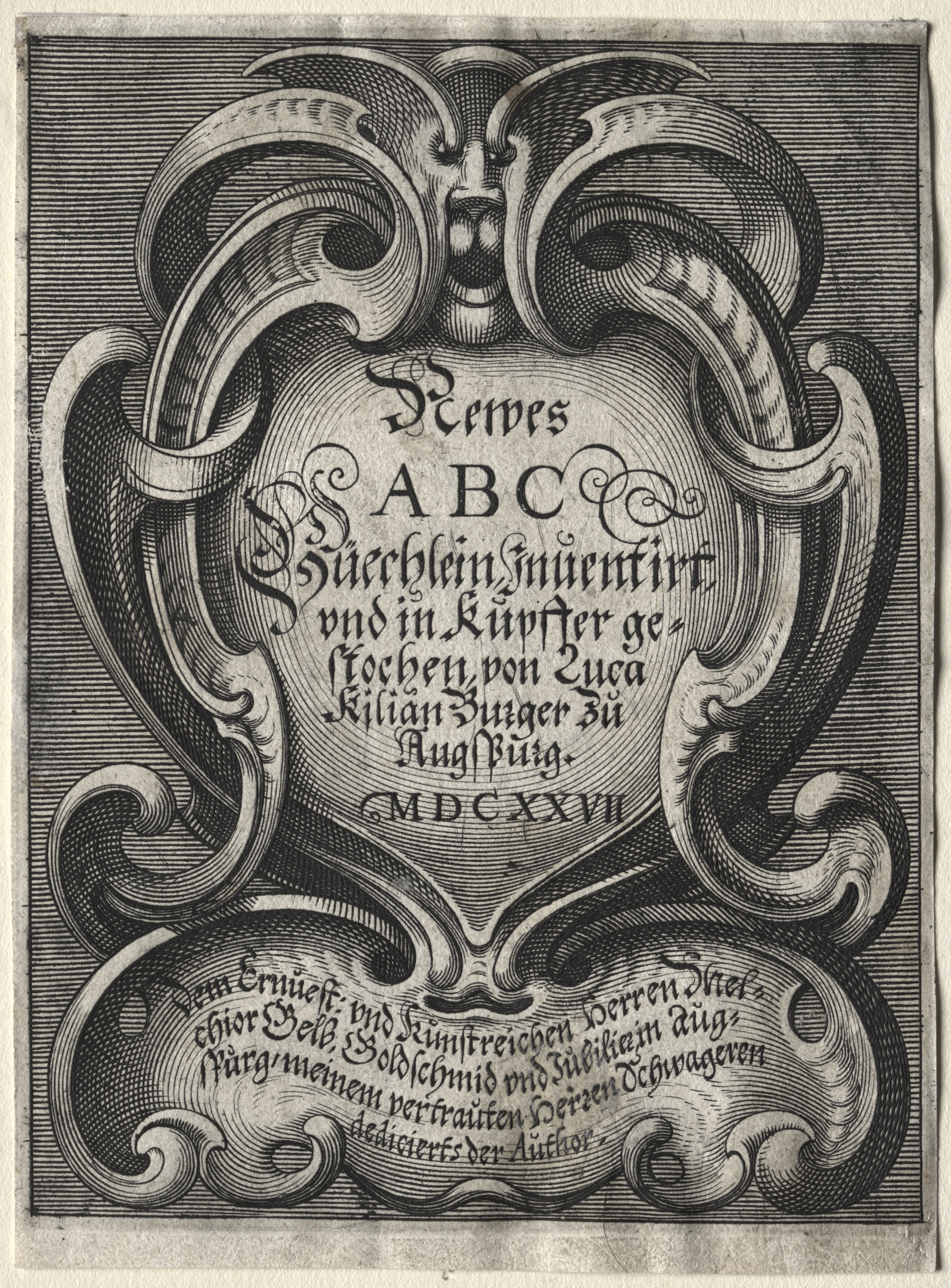 Black and white engraving of a title page with decorative border. The border has curved lines and flourishes. In the center, "Neues A B C" is written in large text. Below that, smaller text reads "Bücherlein, invented and engraved in copper by Lucas Kilian". At the bottom, a date "MDCXXVII" appears. Additional curved lines and flourishes surround the text. The image is framed by a thin border. The text is in an old-fashioned style. The image appears to be on a beige background. The overall design is intricate and ornate.