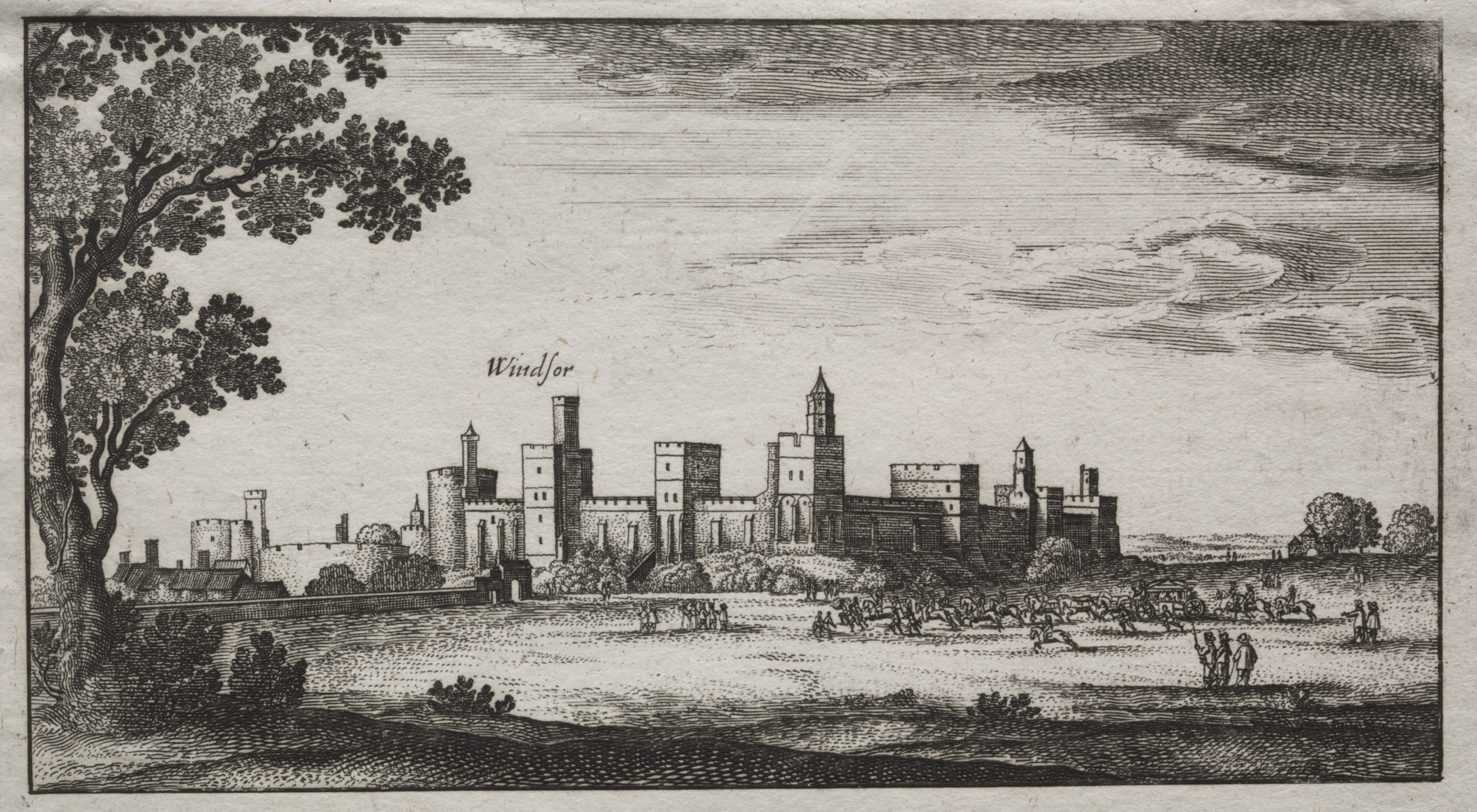 The image depicts Windsor Castle from the southeast. A large tree with a thick trunk and full branches is on the left. A field with people on foot and on horseback, and horse-drawn carriages is in the foreground. The castle is centered, with a large wall and many towers and turrets. The sky is cloudy. The word "Windfor" is written in cursive above the castle. The image is in black and white.