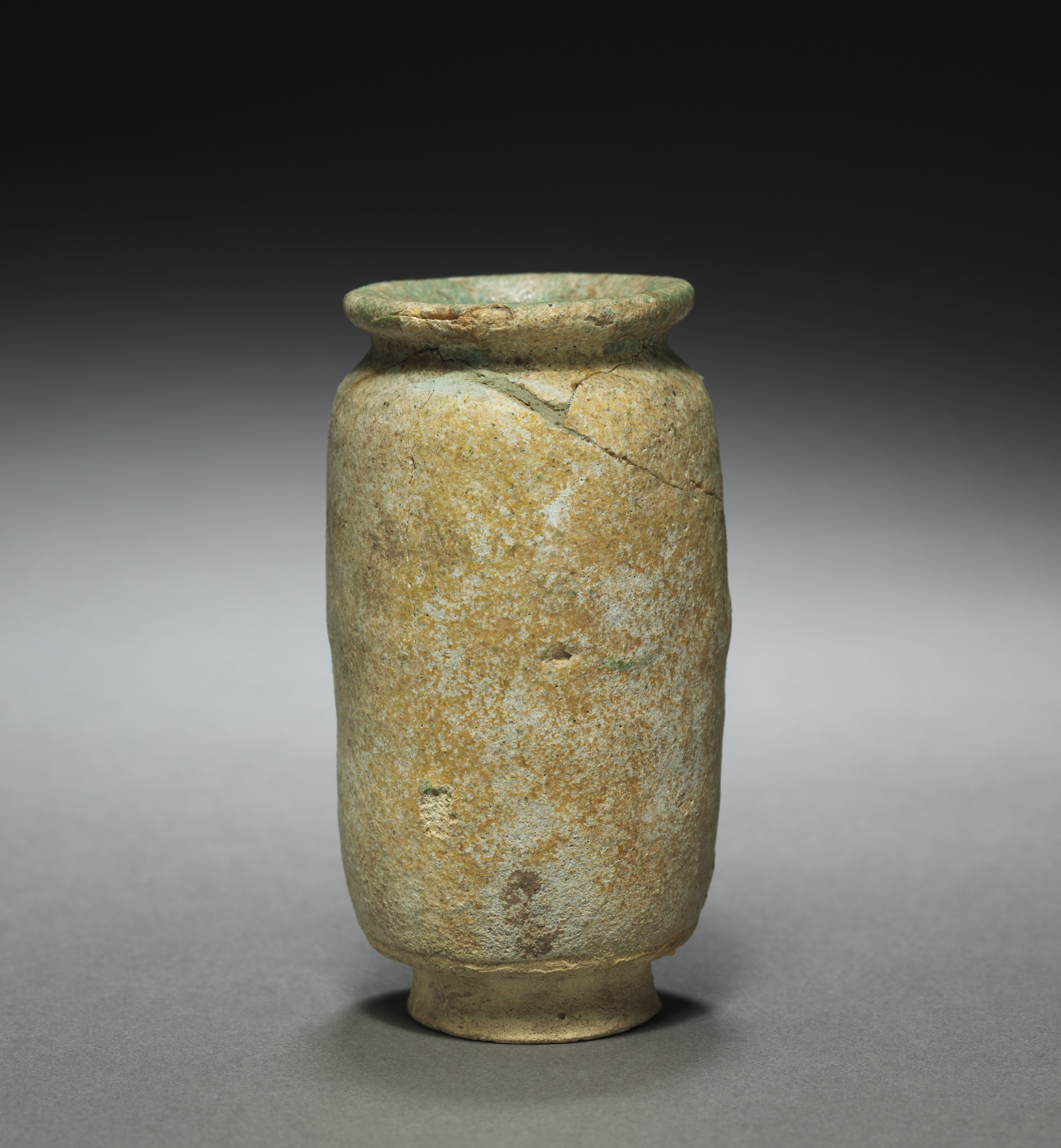 The image shows a weathered clay bottle by an unknown artist. The bottle is tall and slender with a narrow base, a bulbous middle, and a short neck. The mouth of the bottle is wide and flat. The surface is uneven and rough, with visible cracks and imperfections. The color is primarily beige with green and brown undertones. The background is a gradient from dark gray at the top to light gray at the bottom. The bottle casts a shadow on the surface below it. Search for a weathered clay bottle with a narrow base and wide flat mouth.