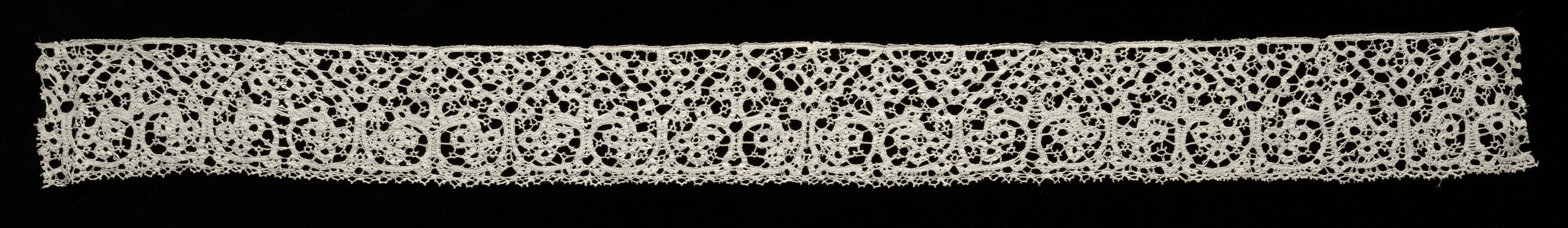 White bobbin lace edging with intricate floral patterns made from numerous small holes and interwoven threads; very delicate and dense; appears hand-made; long and rectangular in shape; slightly wavy edges; against a solid black background. Bobbin Lace Edging.