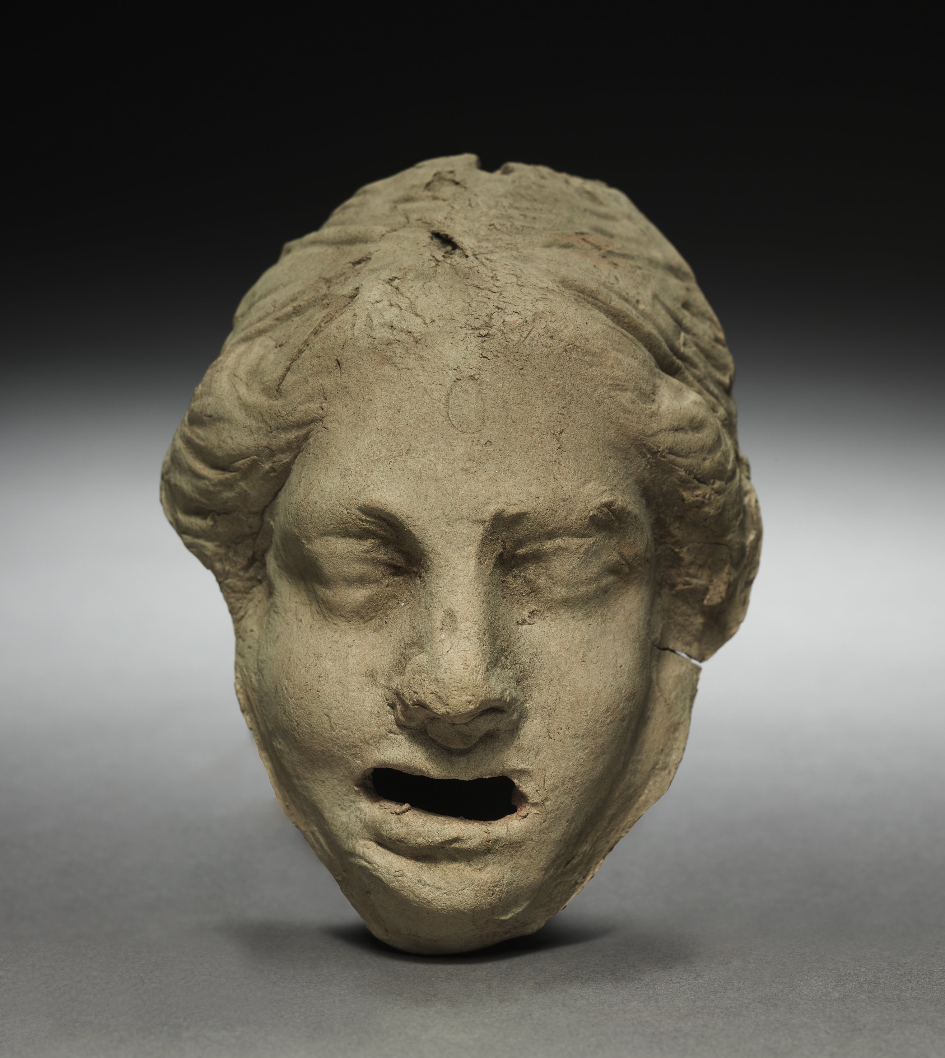The image depicts the head of a weeping woman. The sculpture shows a woman's head with her mouth open and her eyes closed. The woman's face is made of stone or clay and appears to be crying. The head is facing forward, with the mouth open as if in distress or sorrow. The eyes are closed, with the eyelids slightly puckered. The hair is short and styled close to the head, with some texture and detail visible on the surface. The background is a gradient from black at the top to white at the bottom. The overall atmosphere suggests a somber or melancholic mood. The piece appears to be titled "Head of a Weeping Woman" by an unknown artist.