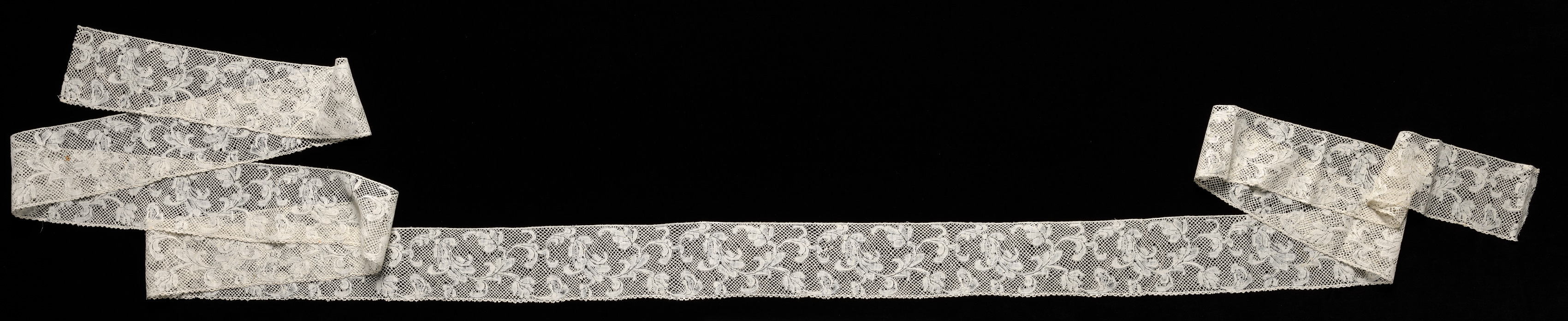 The image depicts a piece of white lace edging. The lace edging is long and narrow, with a repeating pattern throughout. The pattern on the lace edging consists of small white flowers and leaves on a white background. The lace edging has a slightly textured appearance. It is folded and twisted in several places, with four visible folds. The folds are on the left side, with two on top of each other and two on the right side. The background of the image is solid black. The title of the image is Lace Edging.