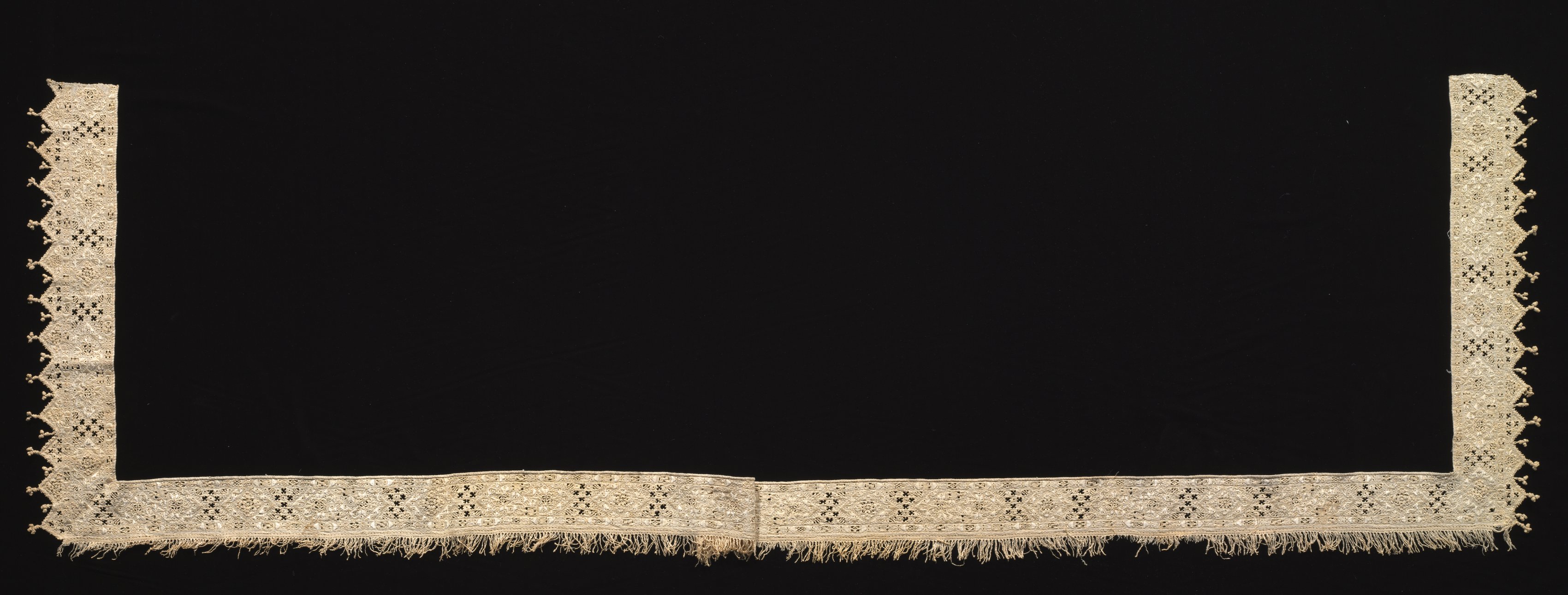 Beige-colored lace edging for a sheet, rectangular in shape with a fringed bottom edge. The lace features a repeating pattern of diamond shapes and circles. Two long, narrow strips extend upwards from either side, each with a zigzag edge. The lace is set against a solid black background.