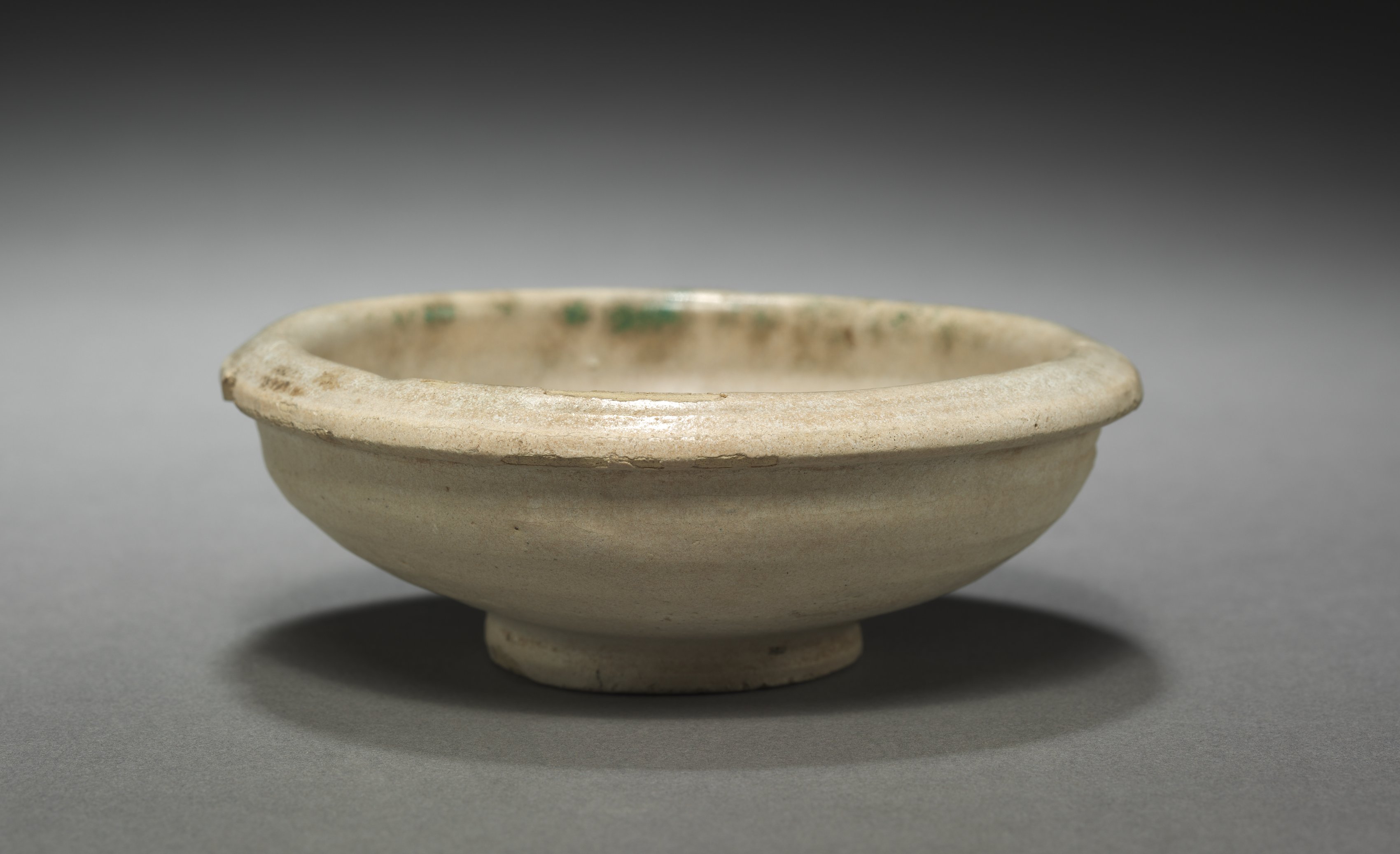 The image depicts "Small Bowl" by an unknown artist. The bowl is off-white with a rough texture. It has a wide mouth and a short foot. The interior rim of the bowl displays green and brown spots, while the exterior appears plain. The bowl casts a shadow on a gray surface that transitions to black in the background.