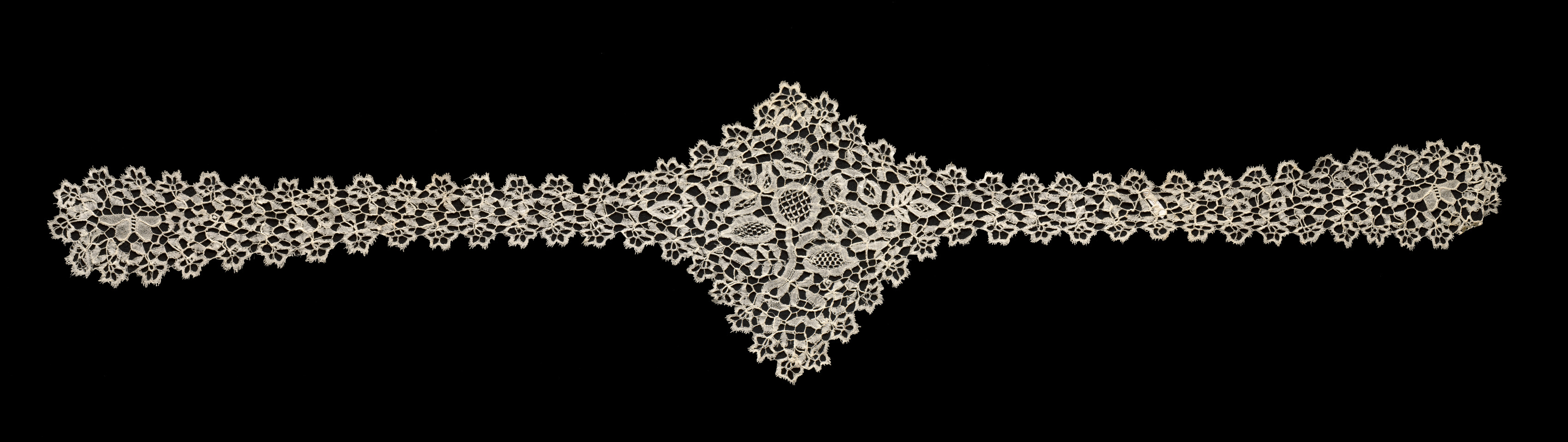 White bobbin lace with a central diamond-shaped section, tapering to a narrower width on both sides. The lace features intricate floral and leaf patterns. The lace artwork is titled "Bobbin Lace Cap Square".