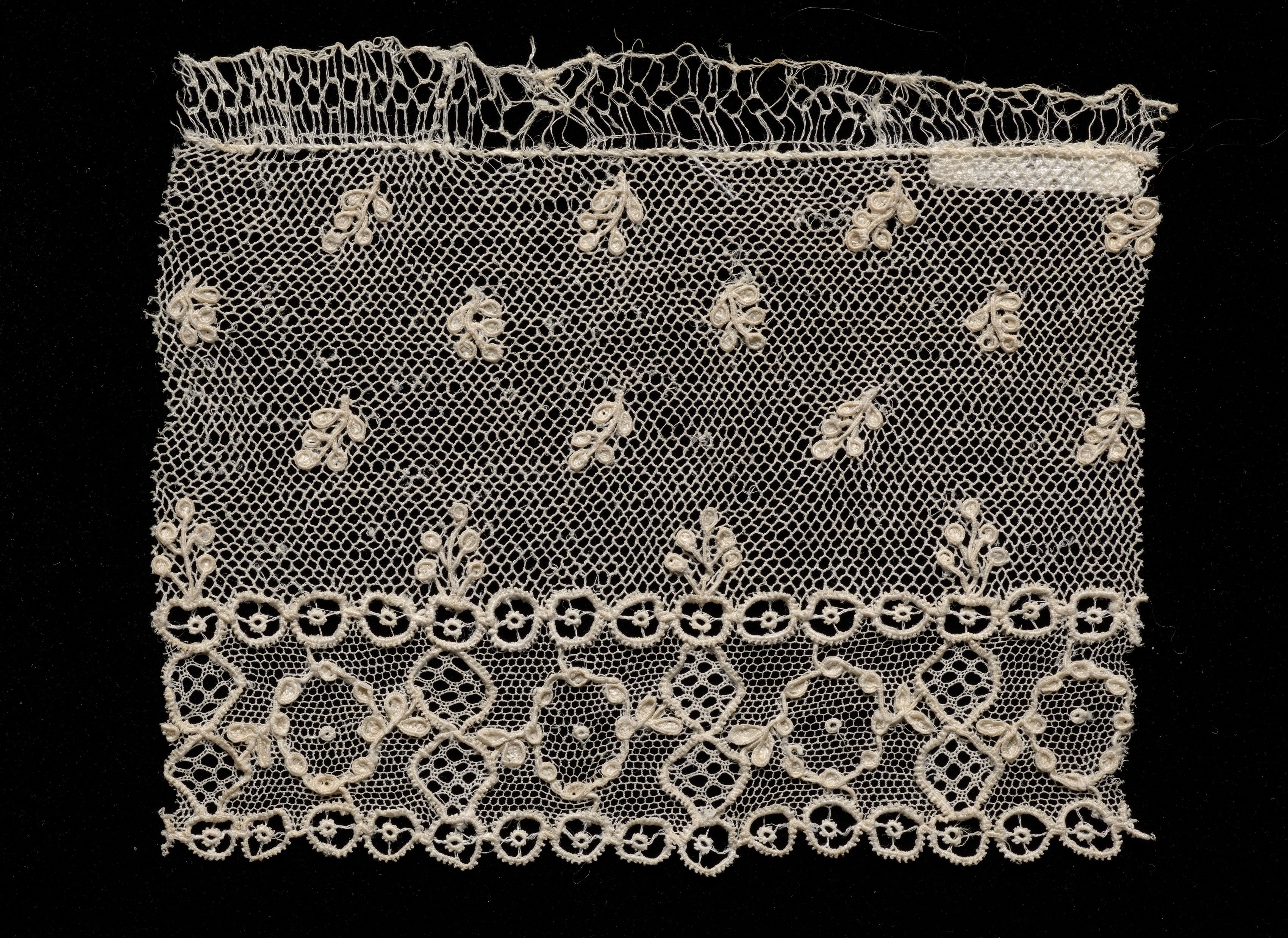 White needlepoint lace edging on a black background. The lace has a rectangular shape. Top edge is scalloped and frayed. The main body has a net-like pattern with small floral motifs. The bottom edge has a more intricate design with interlocking flowers and leaves. The lace appears to be made of a single thread. The background is solid black. The lace edging is titled "Needlepoint Lace Edging".