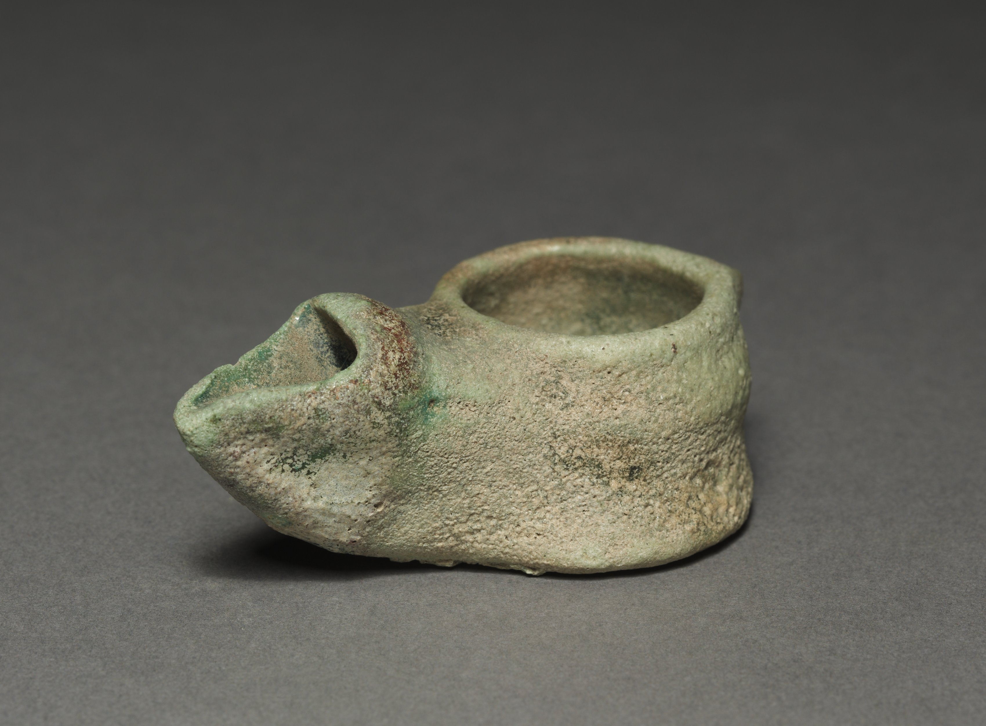 Greenish-brown clay lamp with a rough texture and a small spout-like hole on the left end. The lamp has a circular wick hole. It is lying on its side on a gray surface with a dark gray background. The object titled "Lamp" by an unknown artist.