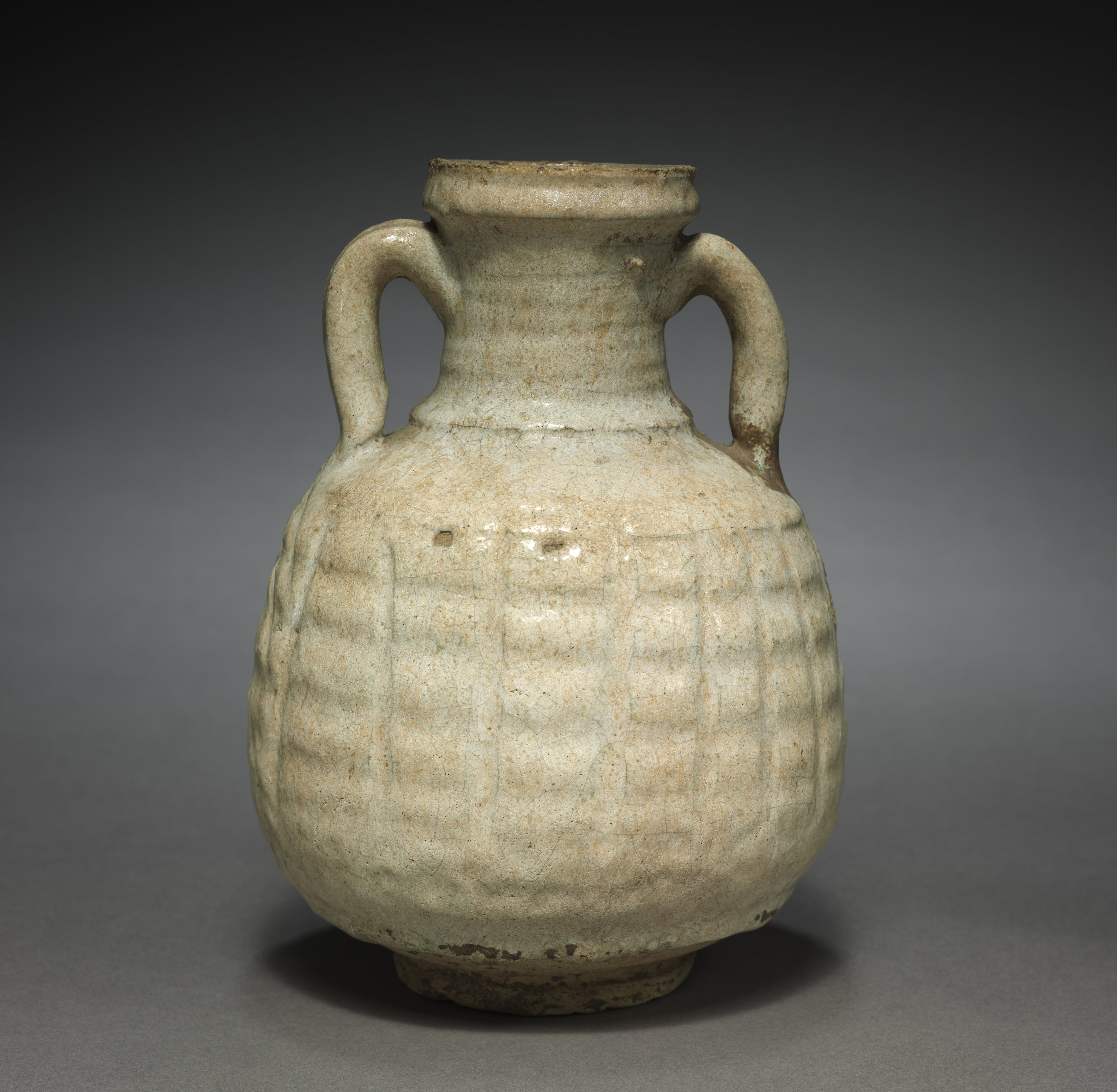 The Vase by an unknown artist is a ceramic object with a predominantly light beige and white coloration, exhibiting brown speckles and darker brown accents. The vase features a rounded body with a narrow neck and a small mouth at the top; it has two handles on either side. The body of the vase displays a grid-like pattern created by raised lines. The base of the vase is small and rounded. The background of the image transitions from dark gray at the top to light gray at the bottom.
