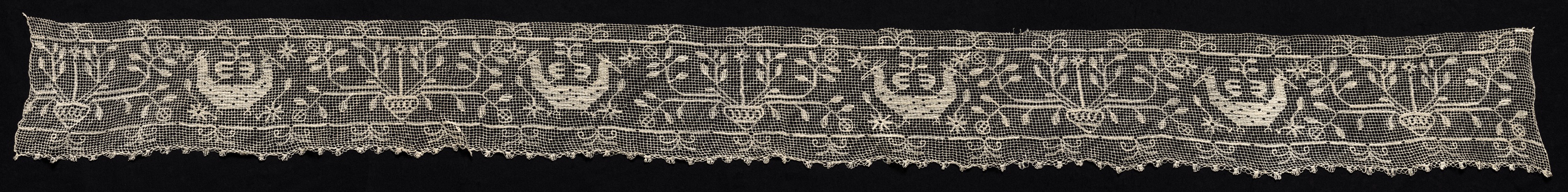 Long, thin, beige lace with a repeating pattern on a black background. The lace has a wavy edge at the top and bottom. The repeating pattern consists of vases with vines and flowers and double-headed birds. The vases have handles on either side and are filled with flowers and vines. The double-headed birds are symmetrical on either side of the vases. The lace is composed of a grid of small holes with threads woven through them to create the design. The image is a long, horizontal rectangle.