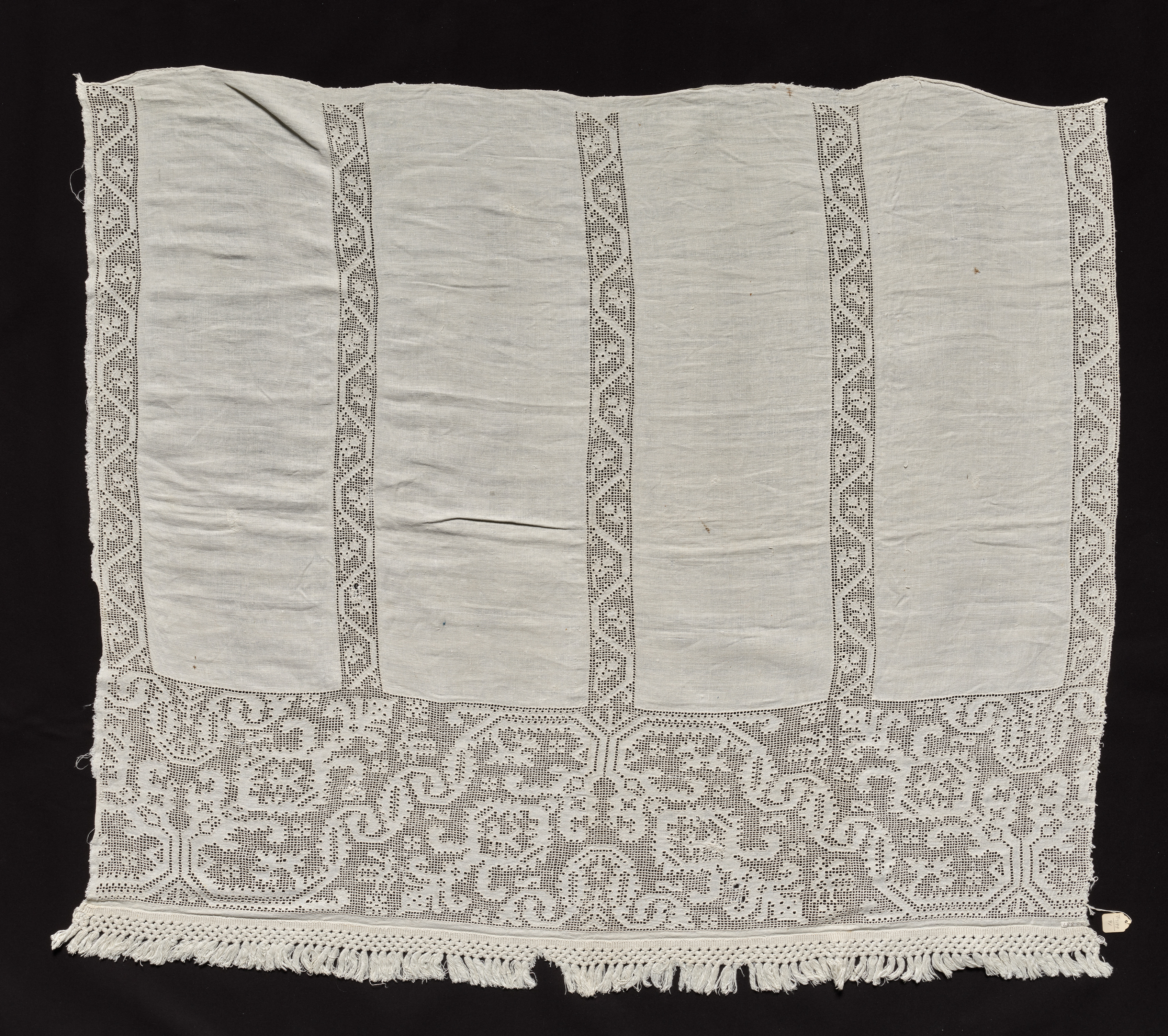 White fabric with a frayed edge at the bottom. Three vertical strips of drawnwork lace run down the fabric, parallel to each other. Two strips with a zigzag pattern on either side and one wider strip in the center with a leafy design. A wider band of drawnwork lace featuring a leafy design at the bottom. The bottom edge of the fabric has a fringe. The fabric appears wrinkled and is set against a black background.